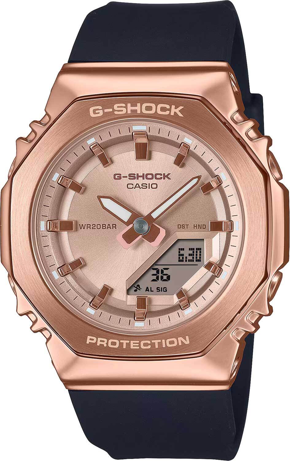 Женские кварцевые аналого-цифровые наручные часы. Серия G-Shock S-series. Противоударный корпус из нержавеющей стали и полимерного пластика защищает механизм часов от ударов и вибраций. Двойная светодиодная подсветка обеспечивает подсветку не только цифрового дисплея, но и аналогового циферблата. Настройка продолжительности подсветки 1,5 или 3 секунды, послесвечение. Светящееся покрытие стрелок обеспечивает длительное послесвечение в темноте после непродолжительного воздействия света. Розовый циферблат с часовыми метками в виде штрихов. 12-ти и 24-х часовой формат отображения времени. Секундомер с точностью показаний 1/100 с (первый час) и 1 с (после первого часа) и временем измерения 24 часа. Режимы измерения: прошедшее время, промежуточное время, два финишных результата. Таймер обратного отсчета от 1 секунды до 24 часов (с интервалом в 1 секунду) с автоповтором. Мировое время - 31 часовой пояс (48 городов), всемирное координированное время (UTC), включение/отключение летнего времени. 5 ежедневных будильников, ежечасный сигнал. Функция перемещения стрелок для удобного просмотра информации на цифровом экране. Функция отключения/включения звука кнопок. Автоматический календарь до 2099 года. Восьмиугольный корпус цвета розового золота из нержавеющей стали и полимерного пластика. Размер корпуса 40,5 мм на 45,9мм, толщина 11мм. Устойчивое к мелким механическим повреждениям минеральное стекло. Чёрный пластиковый ремешок с классической застежкой buckle. Примерный срок службы батареи 3 года. Водонепроницаемость 200WR (плавание и ныряние без акваланга). Вес около 56 г.