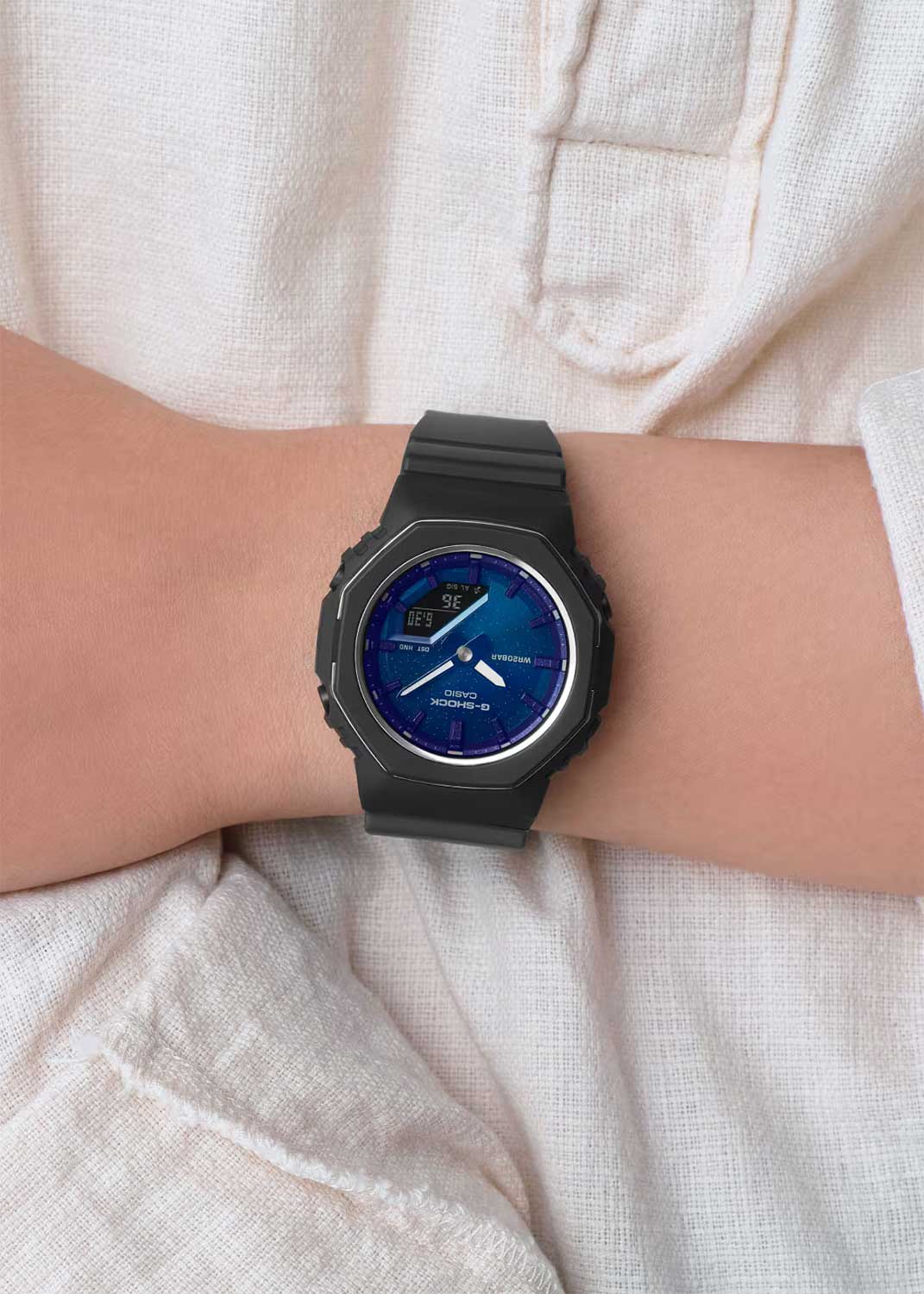 Элегантные и функциональные женские кварцевые часы с аналого-цифровым отображением времени. Серия Casio G-Shock. Модель оснащена тонким металлическим кольцом, которое переливается на свету с обеих сторон безеля. Эти часы компактны и удобны, выглядят более элегантно благодаря металлическому блеску. Обтекаемый безель без логотипов и индикаторов придает часам чистый и минималистичный стиль. Ударопрочная конструкция корпуса защищает механизм часов от ударов и вибрации. Двойная светодиодная подсветка (циферблата и ЖК-дисплея). Настраиваемое послесвечение 1,5 или 3 секунды. Светонакопительное покрытие стрелок обеспечивает длительное послесвечение в темноте после кратковременного воздействия света. 12/24-часовой формат отображения времени. Секундомер с точностью показаний 1/100 секунды (первый час), 1 секунда (после первого часа) и временем измерения 24 часа. Режимы измерения: прошедшее время, промежуточное время, два финишных результата. Таймер обратного отсчета от 1 секунды до 24 часов (с интервалом в 1 секунду) с автоповтором. 10-секундный сигнал об окончании обратного отсчета. Мировое время - 48 городов (31 часовой пояс), всемирное координированное время (UTC), включение/отключение летнего времени, переключение между домашним и мировым временем. 5 ежедневных будильников, ежечасный сигнал. Функция перемещения стрелок для удобного просмотра информации на цифровом дисплее. Функция включения/отключения звука кнопок. Автоматический календарь до 2099 года. Восьмиугольный корпус из биопластика (изготавливается из возобновляемых органических ресурсов) чёрного цвета. Размер корпуса 40,5 мм на 46 мм, толщина 11,3 мм. Синий циферблат с часовыми метками в виде штрихов. Цвет циферблата вдохновлен натуральным камнем лазурит, который считается символом удачи. Устойчивое к мелким механическим повреждениям минеральное стекло.Чёрный ремешок из биопластика (изготавливается из возобновляемых органических ресурсов) с классической застёжкой buckle. Батарея рассчитана на 3 года. Водонепроницаемость 200WR (часы подходят для плавания с маской, трубкой, обычного плавания). Вес около 37 г.