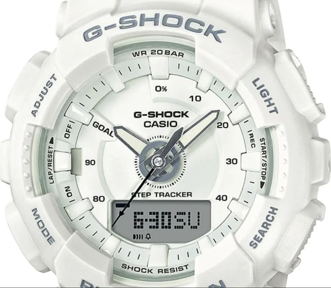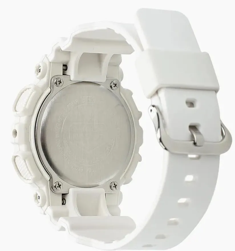 Женские кварцевые наручные часы с аналого-цифровым отображением времени. Серия Casio G-Shock Step Tracker. Противоударный корпус защищает механизм часов от ударов и вибрации. Двойная светодиодная подсветка Super Illuminator обеспечивает подсветку не только аналогового циферблата, но и цифрового дисплея. Настраиваемое послесвечение 1,5 или 3 секунды. Необритовое светонакопительное покрытие стрелок обеспечивает длительное послесвечение в темноте после непродолжительного воздействия света. 12/24-часовой формат отображения времени. Секундомер с точностью показаний 1/100 секунды (первые 60 минут) 1 секунда (через 60 минут) и временем измерения 24 часа. Режимы измерения: прошедшее время, время прохождения дистанции, сохранение в памяти до 30 результатов времени прохождения дистанции. Таймер обратного отсчета от 1 мин до 100 мин с автоповтором. 5 ежедневных будильников, ежечасный сигнал. Шагомер (измеряет количество шагов от 0 до 999999). История подсчета шагов: ежедневные данные (8 дней), еженедельные данные (4 недели). Графическое отображение пройденных шагов за последние 5 часов. Настройка ежедневной нормы по количеству шагов: интервал настройки 1000 шагов, диапазон настройки от 1000 до 50 000 шагов, уведомление о достижении нормы по количеству шагов. Звуковое напоминание об отсутствии активности. Функция сохранения энергии (автоматический переход датчика в спящий режим после фиксированного периода бездействия). Автоматический календарь до 2099 года. Второй часовой пояс (опция, позволяющая отображать время двух часовых поясов одновременно). Функция отключения/включения звука кнопок. Функция перемещения стрелок для удобного просмотра информации на цифровом экране. Круглый корпус из полимерного пластика белого цвета. Размер корпуса 45,9 мм на 49мм, толщина 15,8мм. Устойчивое к мелким механическим повреждениям минеральное стекло. Пластиковый ремешок белого цвета с классической застёжкой buckle. Батарея рассчитана на 2 года. Водонепроницаемость 200WR (плавание и погружение без акваланга). Вес около 53 г.