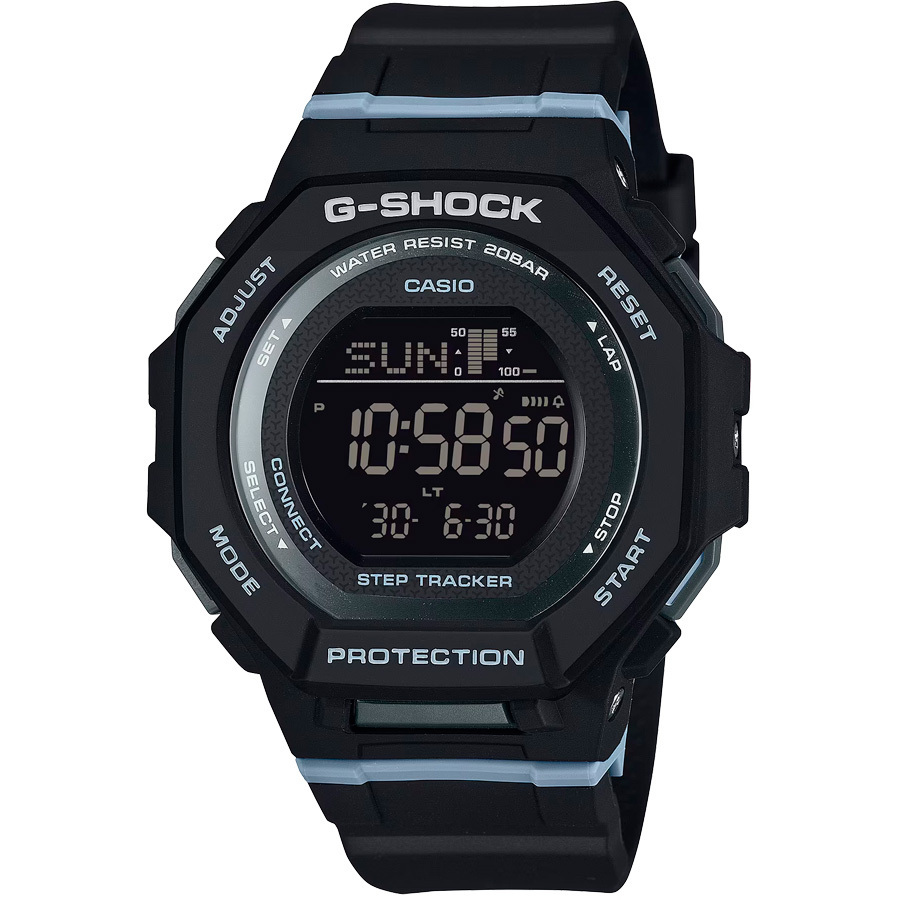 Женские кварцевые электронные наручные часы. Серия Casio G-Shock. Противоударный корпус защищает механизм часов от ударов и вибрации. Часы оснащены беспроводной технологией Bluetooth® со сверхнизким потреблением энергии для синхронизации со смартфоном. При подключении к смартфону часы автоматически корректируют текущее время и получают доступ к ряду полезных функций. Автоматическая светодиодная подсветка с функцией послесвечения, поворот руки при недостаточном освещении обеспечит автоматическое включение подсветки дисплея. Выбираемая длительность подсветки 1,5 или 3 секунды. Шагомер от 0 до 999 999 шагов, отображение прогресса цели по количеству шагов (диапазон установки цели по количеству шагов от 1000 до 50 000, с шагом 1000 шагов), график количества шагов (почасовое количество шагов за последние 7 часов на 6-уровневом графике), индикатор шагов. Секундомер с точностью показаний 1/100 секунды и временем измерения 1 ч. Режимы измерения: прошедшее время, время круга, промежуточное время. Таймер обратного отсчета от 1 секунды до 60 минут с автоматическим повтором. 12/24х часовой формат отображения времени. 5 ежедневных будильников, один с функцией повтора сигнала, ежечасный сигнал. Второй часовой пояс. Включение/выключение звука кнопок. Функция поиска телефона. Автоматический календарь до 2099 года. Журнал тренировок. Анализ статуса тренировок. История активности. Функция энергосбережения. Оповещение о низком заряде батареи. Круглый корпус из биопластика ( изготавливается из возобновляемых органических ресурсов) чёрного цвета. Размеры корпуса 43,8 мм на 46,4 мм, толщина 12 мм. Устойчивое к мелким механическим повреждениям минеральное стекло. Чёрный ремешок из биопластика ( изготавливается из возобновляемых органических ресурсов). Приблизительный срок службы батареи 2 года. Водонепроницаемость 200 WR (плавание и ныряние без акваланга). Вес около 41 г.