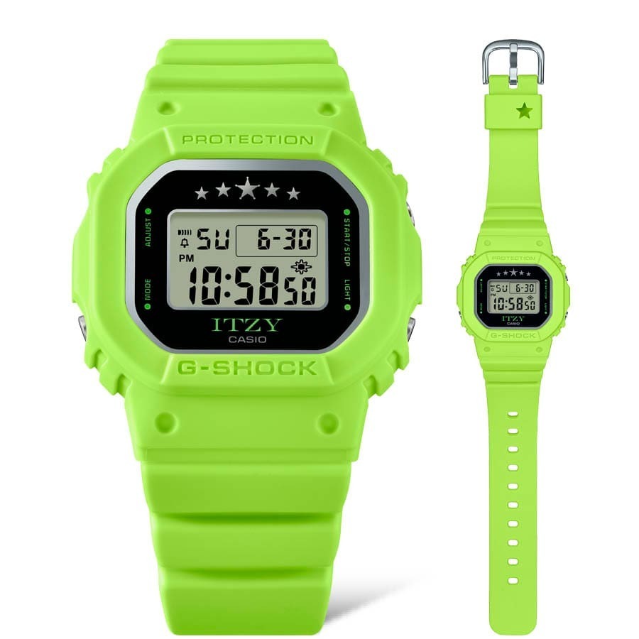 Женские электронные кварцевые наручные часы. Серия Casio G-Shock limited. Модель выпущена в сотрудничестве G-Shock и Itzy — популярной южнокорейской гёрл-группы жанра K-pop. Логотип группы Itzy украшает нижнюю часть циферблата часов, а на верхней нарисованы 5 звезд — по количеству участниц группы. Противоударный корпус защищает механизм часов от ударов и вибрации. Дисплей подсвечивается ярким светодиодом с функцией послесвечения. При включении подсветки на дисплее появляются 5 сердечек. Световая индикация сигнала (LED-индикатор) - светодиодная лампочка мигает при сигнале будильника, окончании таймера обратного отсчета или секундомера. 12-ти и 24-х часовой формат отображения времени. Секундомер с точностью показаний 1/100 секунды (первый час), 1 секунда (через 1 час) и временем измерения 24 часа. Режимы измерения: прошедшее время, промежуточное время, два финишных результата. Таймер обратного отсчета от 1 секунды до 24 часов с автоповтором. Многофункциональный будильник, ежечасный сигнал. Автоматический календарь до 2099 года. Прямоугольный корпус из биопластика (изготавливается из возобновляемых органических ресурсов) зелёного цвета. Размеры корпуса 40,5 мм на 45,7мм, толщина 11,9мм. Устойчивое к мелким механическим повреждениям минеральное стекло. Зелёный ремешок из биопластика (изготавливается из возобновляемых органических ресурсов) с классической застежкой Buckle. Батарейка рассчитана на 3 года. На стальной задней крышке часов выгравированы пять автографов участниц группы Itzy. Водонепроницаемость 200WR (плавание и ныряние без акваланга). Вес около 42 г. Часы поставляются в специальной упаковке, украшенной логотипами ITZY и G-SHOCK. На внешней коробке напечатаны автографы каждой из участниц группы .