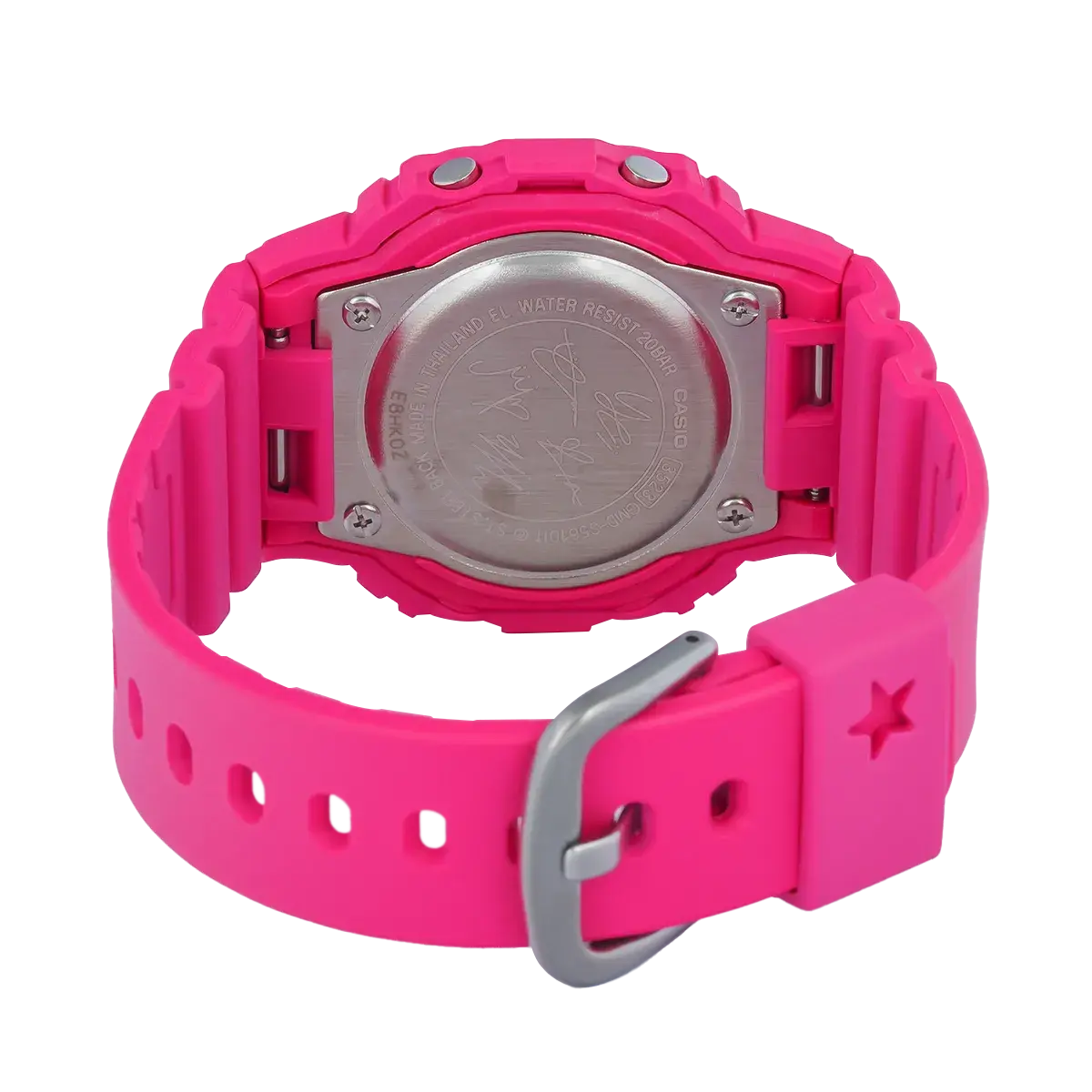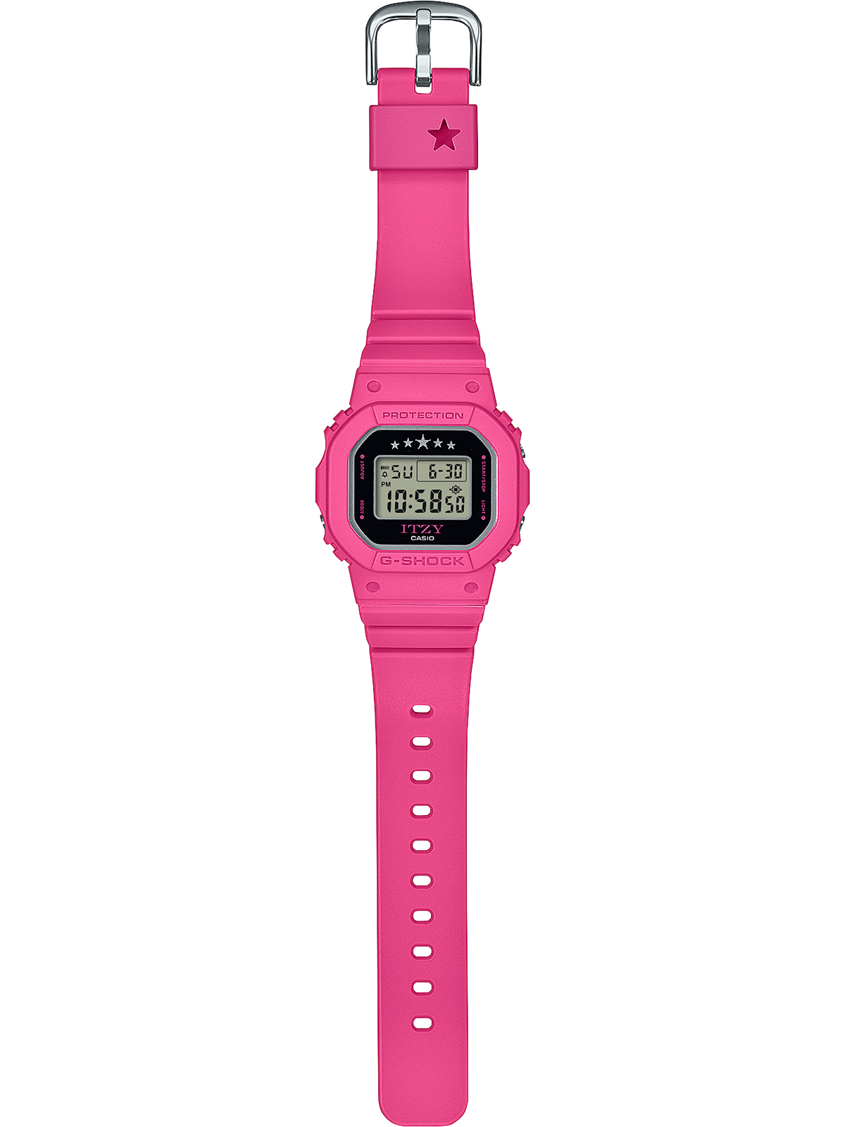 Женские электронные кварцевые наручные часы. Серия Casio G-Shock limited. Модель выпущена в сотрудничестве G-Shock и Itzy — популярной южнокорейской гёрл-группы жанра K-pop. Логотип группы Itzy украшает нижнюю часть циферблата часов, а на верхней нарисованы 5 звезд — по количеству участниц группы. Противоударный корпус защищает механизм часов от ударов и вибрации. Дисплей подсвечивается ярким светодиодом с функцией послесвечения. При включении подсветки на дисплее появляются 5 сердечек. Световая индикация сигнала (LED-индикатор) - светодиодная лампочка мигает при сигнале будильника, окончании таймера обратного отсчета или секундомера. 12-ти и 24-х часовой формат отображения времени. Секундомер с точностью показаний 1/100 секунды (первый час), 1 секунда (через 1 час) и временем измерения 24 часа. Режимы измерения: прошедшее время, промежуточное время, два финишных результата. Таймер обратного отсчета от 1 секунды до 24 часов с автоповтором. Многофункциональный будильник, ежечасный сигнал. Автоматический календарь до 2099 года. Прямоугольный корпус из биопластика (изготавливается из возобновляемых органических ресурсов) розового цвета. Размеры корпуса 40,5 мм на 45,7мм, толщина 11,9мм. Устойчивое к мелким механическим повреждениям минеральное стекло. Розовый ремешок из биопластика (изготавливается из возобновляемых органических ресурсов) с классической застежкой Buckle. Батарейка рассчитана на 3 года. На стальной задней крышке часов выгравированы пять автографов участниц группы Itzy. Водонепроницаемость 200WR (плавание и ныряние без акваланга). Вес около 42 г. Часы поставляются в специальной упаковке, украшенной логотипами ITZY и G-SHOCK. На внешней коробке напечатаны автографы каждой из участниц группы .