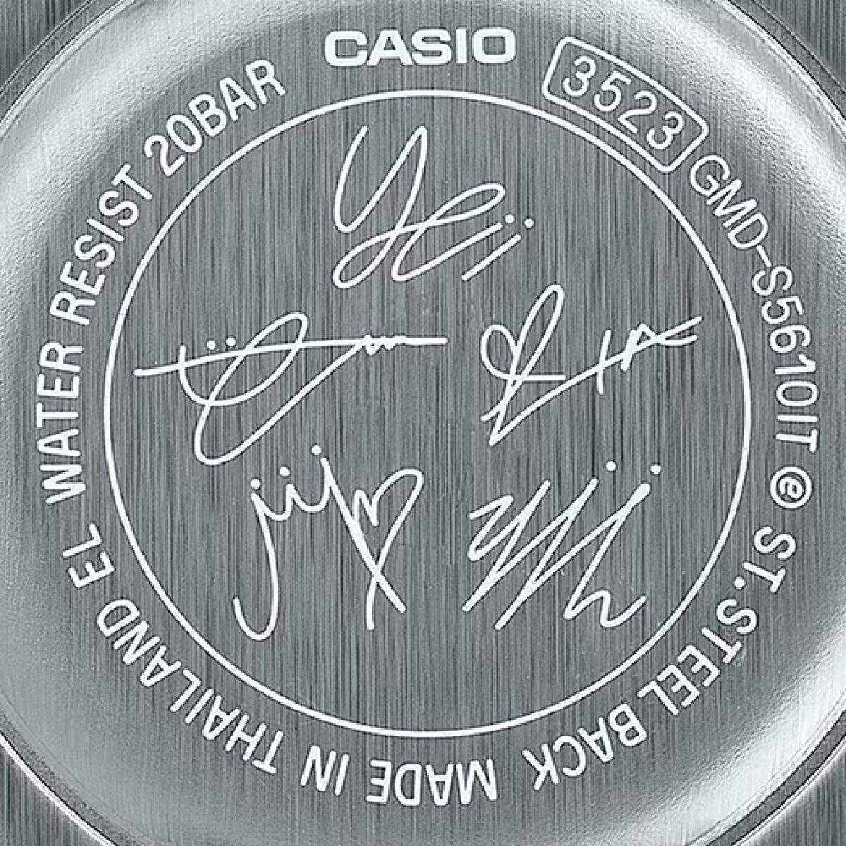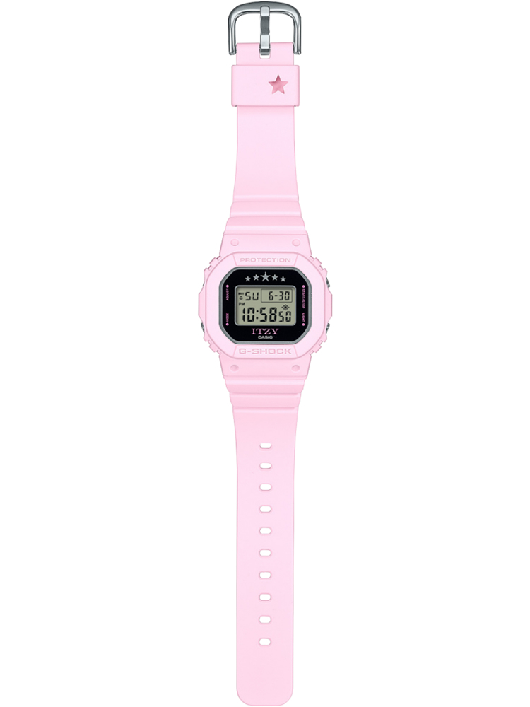 Женские электронные кварцевые наручные часы. Серия Casio G-Shock limited. Модель выпущена в сотрудничестве G-Shock и Itzy — популярной южнокорейской гёрл-группы жанра K-pop. Логотип группы Itzy украшает нижнюю часть циферблата часов, а на верхней нарисованы 5 звезд — по количеству участниц группы. Противоударный корпус защищает механизм часов от ударов и вибрации. Дисплей подсвечивается ярким светодиодом с функцией послесвечения. При включении подсветки на дисплее появляются 5 сердечек. Световая индикация сигнала (LED-индикатор) - светодиодная лампочка мигает при сигнале будильника, окончании таймера обратного отсчета или секундомера. 12-ти и 24-х часовой формат отображения времени. Секундомер с точностью показаний 1/100 секунды (первый час), 1 секунда (через 1 час) и временем измерения 24 часа. Режимы измерения: прошедшее время, промежуточное время, два финишных результата. Таймер обратного отсчета от 1 секунды до 24 часов с автоповтором. Многофункциональный будильник, ежечасный сигнал. Автоматический календарь до 2099 года. Прямоугольный корпус из биопластика (изготавливается из возобновляемых органических ресурсов) розового цвета. Размеры корпуса 40,5 мм на 45,7мм, толщина 11,9мм. Устойчивое к мелким механическим повреждениям минеральное стекло. Розовый ремешок из биопластика (изготавливается из возобновляемых органических ресурсов) с классической застежкой Buckle. Батарейка рассчитана на 3 года. На стальной задней крышке часов выгравированы пять автографов участниц группы Itzy. Водонепроницаемость 200WR (плавание и ныряние без акваланга). Вес около 42 г. Часы поставляются в специальной упаковке, украшенной логотипами ITZY и G-SHOCK. На внешней коробке напечатаны автографы каждой из участниц группы .