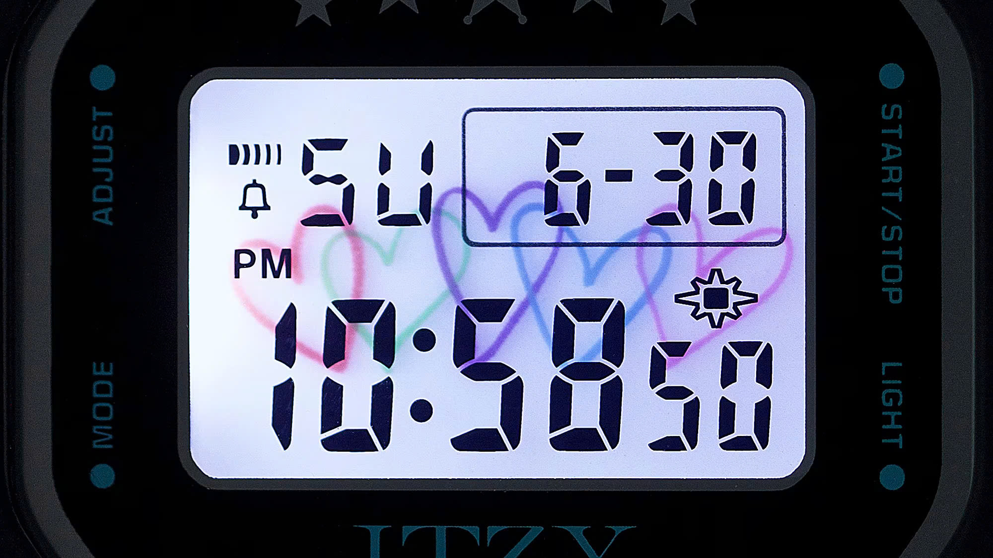 Женские электронные кварцевые наручные часы. Серия Casio G-Shock limited. Модель выпущена в сотрудничестве G-Shock и Itzy — популярной южнокорейской гёрл-группы жанра K-pop. Логотип группы Itzy украшает нижнюю часть циферблата часов, а на верхней нарисованы 5 звезд — по количеству участниц группы. Противоударный корпус защищает механизм часов от ударов и вибрации. Дисплей подсвечивается ярким светодиодом с функцией послесвечения. При включении подсветки на дисплее появляются 5 сердечек. Световая индикация сигнала (LED-индикатор) - светодиодная лампочка мигает при сигнале будильника, окончании таймера обратного отсчета или секундомера. 12-ти и 24-х часовой формат отображения времени. Секундомер с точностью показаний 1/100 секунды (первый час), 1 секунда (через 1 час) и временем измерения 24 часа. Режимы измерения: прошедшее время, промежуточное время, два финишных результата. Таймер обратного отсчета от 1 секунды до 24 часов с автоповтором. Многофункциональный будильник, ежечасный сигнал. Автоматический календарь до 2099 года. Прямоугольный корпус из биопластика (изготавливается из возобновляемых органических ресурсов)фиолетового цвета. Размеры корпуса 40,5 мм на 45,7мм, толщина 11,9мм. Устойчивое к мелким механическим повреждениям минеральное стекло. Фиолетовый ремешок из биопластика (изготавливается из возобновляемых органических ресурсов) с классической застежкой Buckle. Батарейка рассчитана на 3 года. На стальной задней крышке часов выгравированы пять автографов участниц группы Itzy. Водонепроницаемость 200WR (плавание и ныряние без акваланга). Вес около 42 г. Часы поставляются в специальной упаковке, украшенной логотипами ITZY и G-SHOCK. На внешней коробке напечатаны автографы каждой из участниц группы .