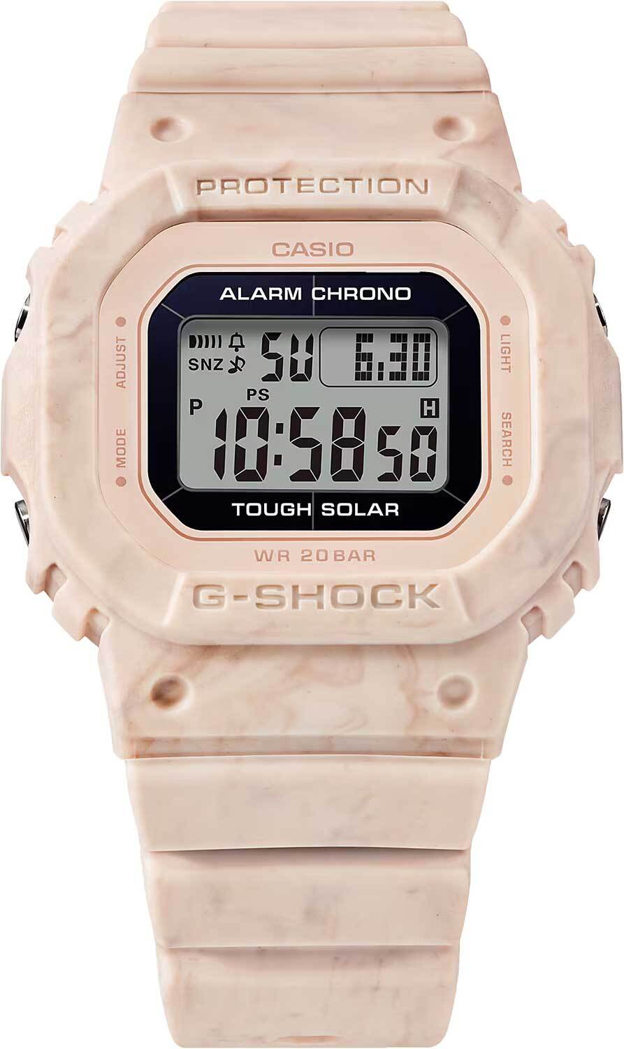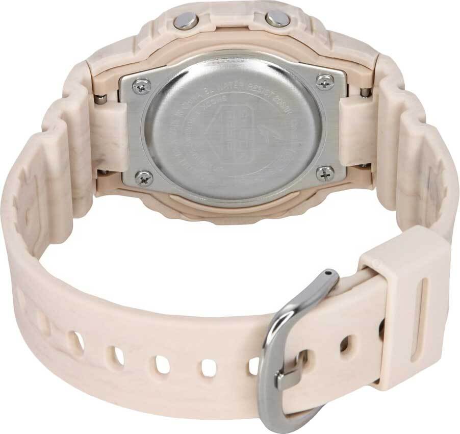 Женские кварцевые электронные наручные часы на солнечной батарее. Серия Casio G-Shock. Питание от солнечной энергии (технология Tough Solar) - источником питания служит светочувствительная панель и аккумулятор, подзаряжаемый при попадании солнечного света на дисплей часов. Противоударный корпус защищает механизм часов от ударов и вибрации. Светодиодная подсветка с функцией послесвечения. Выбираемая длительность подсветки 1,5 или 3 секунды. 12-ти и 24-х часовой формат отображения времени. Секундомер с точностью измерения 1/100с (до 1ч) и 1с (после 1ч) и временем измерения 24ч. Режимы измерения: прошедшее время, промежуточное время, два финишных результата. Таймер обратного отсчета от 1 с до 24 часов. 5 ежедневных будильников ( один с повтором сигнала), ежечасный сигнал. Мировое время - 48 городов (31 часовой пояс), всемирное координированное время (UTC), включение/отключение летнего времени (DST), переключение между домашним и мировым временем. Автоматический календарь до 2099 года, возможность выбра дня недели на шести языках. Функция включения/выключения звука кнопок (Mute). Функция энергосбережения - в темноте дисплей гаснет для экономии энергии. Индикатор уровня заряда батареи. Срок работы аккумулятора около 13 месяцев, и около 22 месяцев при включенной функции энергосбережения после полной зарядки. Прямоугольный корпус из биопластика (изготавливается из возобновляемых органических ресурсов) бежевого цвета. Устойчивое к мелким механическим повреждениям минеральное стекло. Бежевый ремешок из биопластика (изготавливается из возобновляемых органических ресурсов), стандартная застёжка buckle. Мраморный узор на корпусе и ремешке вдохновлен величием скал и камней нетронутых земель Водонепроницаемость 200 WR (плавание и ныряние без акваланга). Вес около 41 г.