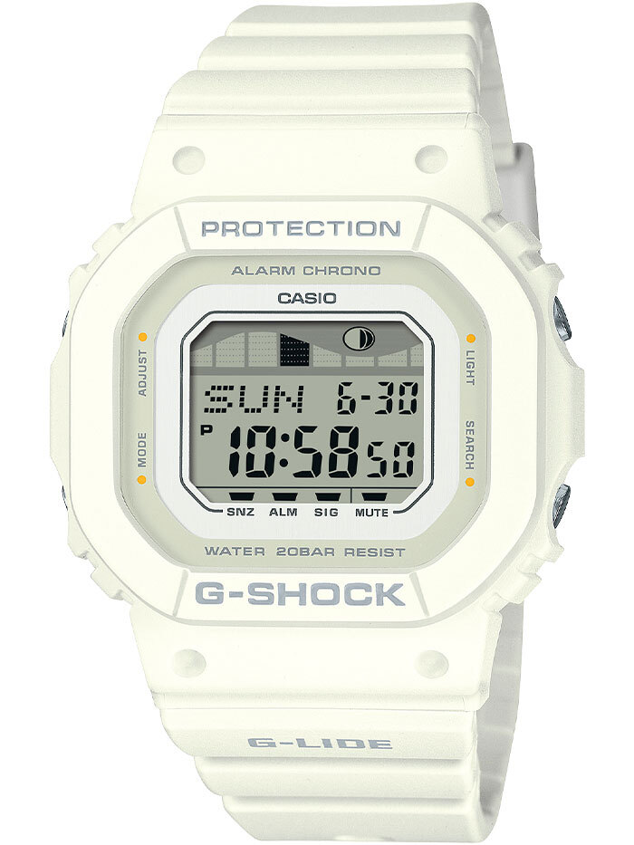 Женские кварцевые наручные часы c цифровым отображением времени. Серия Casio G-Shock G-Lide. Противоударный корпус защищает механизм часов от ударов и вибрации. Циферблат подсвечивается ярким светодиодом. Настраиваемое послесвечение 1,5 или 3с. Световая индикация сигнала (LED-индикатор) - мигание подсветки при работе будильника, таймера или секундомера. Отображение возраста и графика фаз Луны. Графическое отображение сведений о приливах и отливах на заданную дату и время. Мировое время - 48 городов (29 часовых поясов), функция включения/отключения летнего времени, отображение кода города. Секундомер с точностью измерения 1/100 с и временем измерения 24 часа. Режимы измерения: прошедшее время, промежуточное время, два финишных результата. Таймер обратного отсчета от 1 минуты до 24 часов с автоповтором. Будильник с тремя многофункциональными звуковыми сигналами (один с функцией повтора сигнала Snooze), ежечасный сигнал. Автоматический календарь до 2099 года. 12/24 часовой формат отображения времени. Функция включение/выключение звука кнопок. Прямоугольный корпус из биопластика (изготавливается из возобновляемых органических ресурсов) белого цвета. Размер корпуса 40,5 мм на 45,7мм, толщина 11,9мм. Устойчивое к мелким механическим повреждениям минеральное стекло. Стальная задняя крышка. Белый ремешок из биопластика (изготавливается из возобновляемых органических ресурсов) с классической застежкой buckle. Батарея рассчитана на 3 года. Водонепроницаемость 200WR (плавание и погружение без акваланга). Вес около 41 г