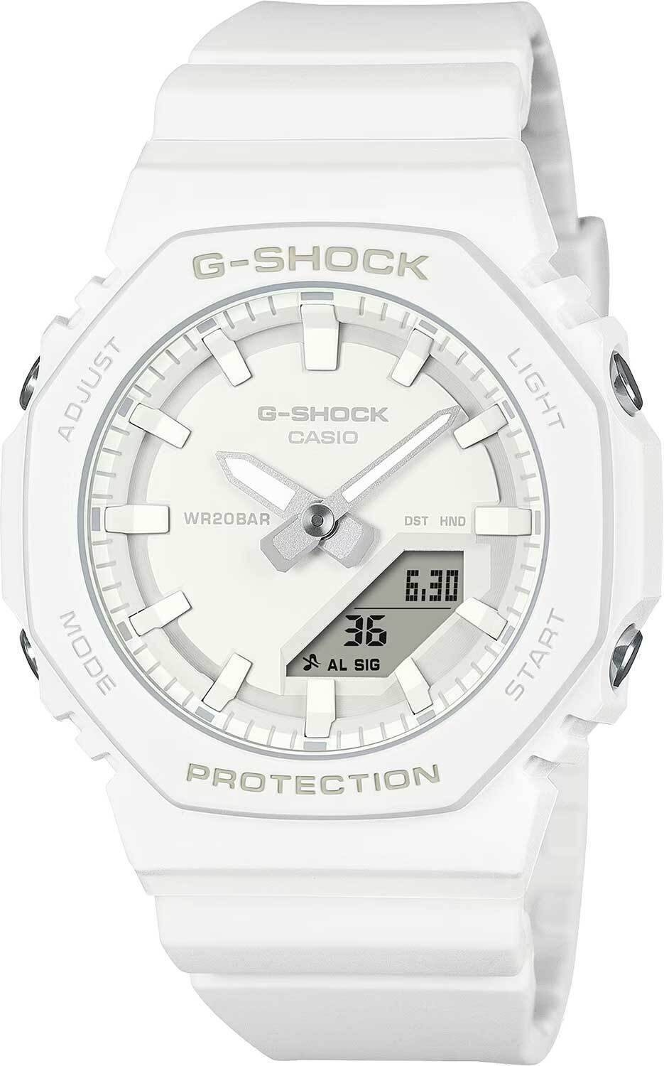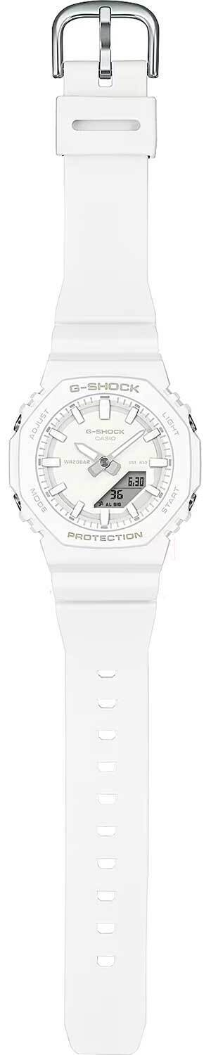 Женские аналого-цифровые кварцевые наручные часы. Серия Casio G-Shock. Противоударный пластиковый корпус защищает внутренний модуль часов от повреждений и деформаций при ударах. Двойная светодиодная подсветка (циферблата и ЖК-дисплея) , настройка продолжительности подсветки 1,5 или 3 секунды, послесвечение. 12-ти и 24-х часовой формат отображения времени. Светящееся покрытие стрелок обеспечивает длительную подсветку в темное время суток после короткого воздействия света. Секундомер с точностью показаний 1/100с (первый час) и 1 секунда (после первого часа) и временем измерения 24ч. Режимы измерения: прошедшее время, промежуточное время, два финишных результата. Таймер обратного отсчета от 1с до 24ч (с интервалом в 1 секунду). Мировое время – 48 городов (31 часовой пояс), всемирное координированное время (UTC). Функция включения/отключения летнего времени. Автоматический календарь до 2099 г. Функции отключения/включения звука кнопок. Функция перемещения стрелок. 5 ежедневных будильников, сигнал начала часа. Минеральное стекло устойчивое к мелким механическим повреждениям. Корпус выполнен из биопластика белого цвета, который изготавливается из возобновляемых органических ресурсов. Стальная задняя крышка. Ремешок выполнен из биопластика белого цвета, который изготавливается из возобновляемых органических ресурсов, классическая застежка buckle. Водонепроницаемость 200 WR (ныряние и плавание без акваланга). Вес около 40 г.