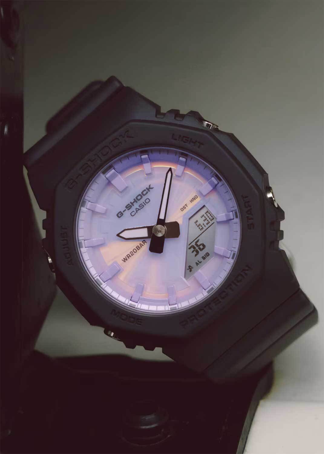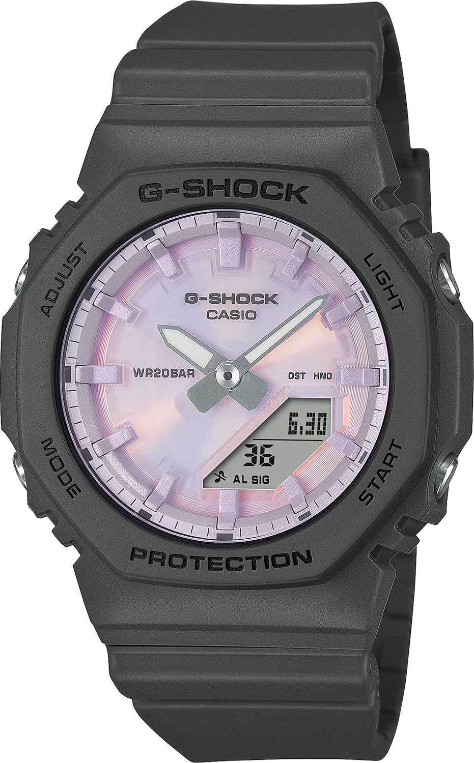 Женские кварцевые наручные часы c аналого-цифровым отображением времени. Серия Casio G-Shock. Дизайн циферблата вдохновлён мерцанием солнечного света на морских волнах. Циферблат украшен поляризованным цветным напылением, благодаря чему циферблат меняет тон и яркость при каждом повороте запястья, создавая эффект солнечных бликов на воде. Безель и ремешок с матовой текстурой создают стильный контраст с блестящими элементами циферблата и корпуса. Противоударный пластиковый корпус защищает внутренний модуль часов от повреждений и деформаций при ударах и вибрации. Двойная светодиодная подсветка обеспечивает подсветку не только аналогового циферблата, но и цифрового дисплея, настройка продолжительности подсветки 1,5 или 3 секунды, послесвечение. 12-ти и 24-х часовой формат отображения времени. Светящееся покрытие стрелок обеспечивает длительное послесвечение в темноте после короткого воздействия света. Секундомер с точностью показаний 1/100с (первый час) и 1 секунда (после первого часа) и временем измерения 24ч. Режимы измерения: прошедшее время, промежуточное время, два финишных результата. Таймер обратного отсчета от 1с до 24ч (с интервалом в 1 секунду). Мировое время – 48 городов (31 часовой пояс), всемирное координированное время (UTC). Функция включения/отключения летнего времени. Автоматический календарь до 2099 г. Функции отключения/включения звука кнопок. Функция перемещения стрелок для удобного просмотра информации на цифровом дисплее. 5 ежедневных будильников, сигнал начала часа. Минеральное стекло устойчивое к мелким механическим повреждениям. Перламутровый фиолетовый циферблат с часовыми метками в виде штрихов. Восьмиугольный корпус из биопластика (изготавливается из возобновляемых органических ресурсов) чёрного цвета. Габаритные размеры корпуса 40,2 мм на 46мм, толщина 11,2мм. Стальная задняя крышка. Ремешок из биопластика (изготавливается из возобновляемых органических ресурсов) чёрного цвета, классическая застежка buckle. Водонепроницаемость 200WR (ныряние и плавание без акваланга). Батарейка рассчитана на 3 года. Вес около 40 г.