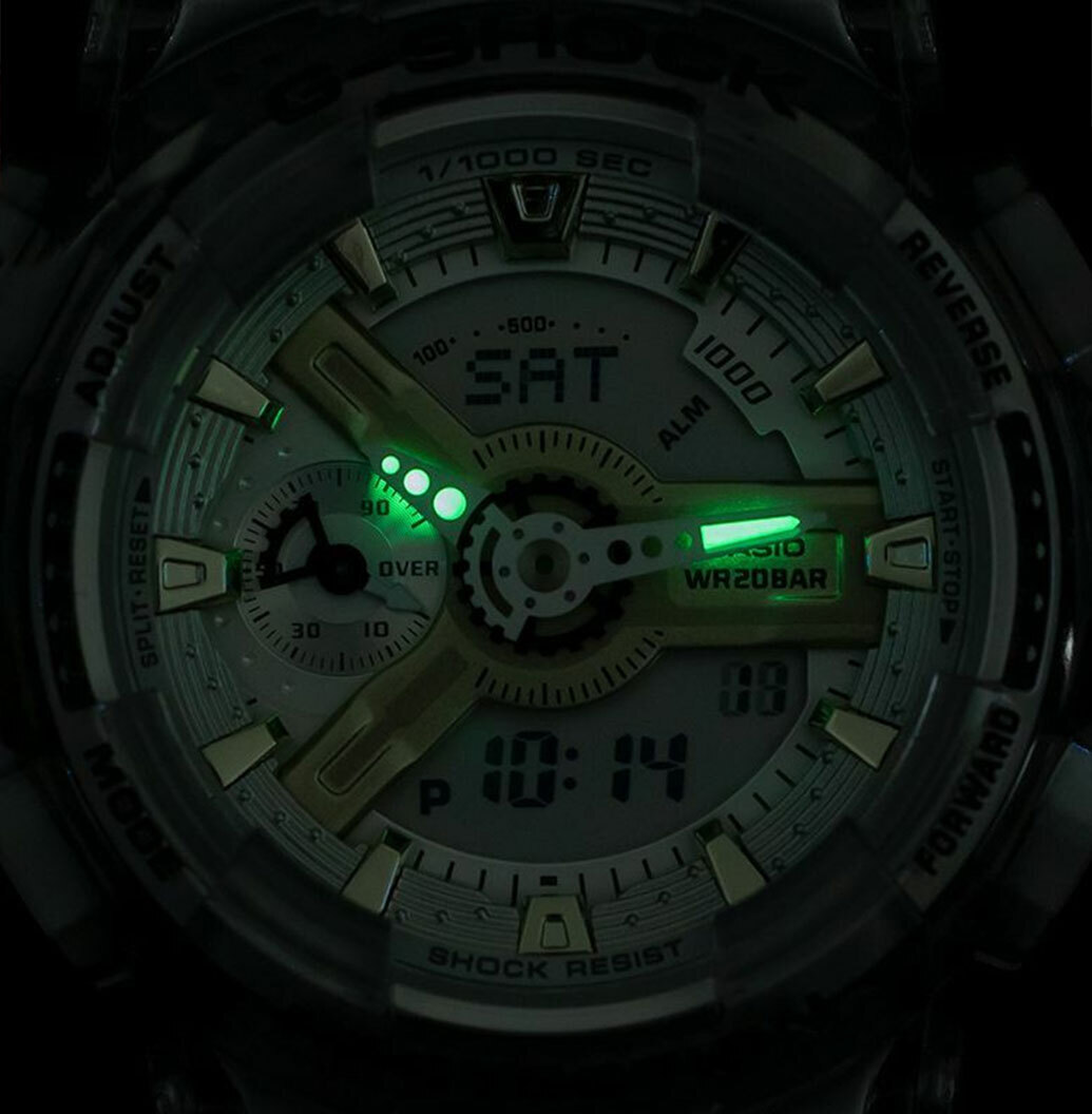 Женские кварцевые наручные часы c аналого-цифровым отображением времени. Серия Casio G-Shock S-series. Противоударный корпус защищает механизм часов от ударов и вибрации. Автоматическая светодиодная подсветка — при недостаточном освещении поворот руки включает подсветку циферблата, выбор продолжительности подсветки 1,5 секунды или 3 секунды, послесвечение. Стрелки с люминесцентным покрытием, которое светится в темноте после непродолжительного воздействия света. Мировое время – 48 городов (29 часовых поясов), всемирное координированное время (UTC), включение/отключение летнего времени, переключение между домашним и мировым временем. 12-ти и 24-х часовой формат отображения времени. Секундомер с точностью показаний 1/1000 с и временем измерения 100 ч. Режимы измерения: пройденное время, время круга, промежуточное время. Расчет скорости по выбранной дистанции. Таймер обратного отсчета от 1 мин до 24 ч (с интервалом в 1 минуту и с интервалом в 1 час) с автоповтором. 5 ежедневных будильников, один с функцией повтора сигнала (Snooze), ежечасный сигнал. Автоматический календарь до 2099 года. Круглый корпус из полупрозрачного пластика серого цвета. Размер корпуса 45,9 мм на 49мм, толщина 15,8мм. Устойчивое к мелким механическим повреждениям минеральное стекло. Полупрозрачный пластиковый ремешок серого цвета с классической застежкой Buckle. Приблизительный срок службы батареи 2 года. Водонепроницаемость 200 WR (плавание и ныряние без акваланга). Вес около 56 г.