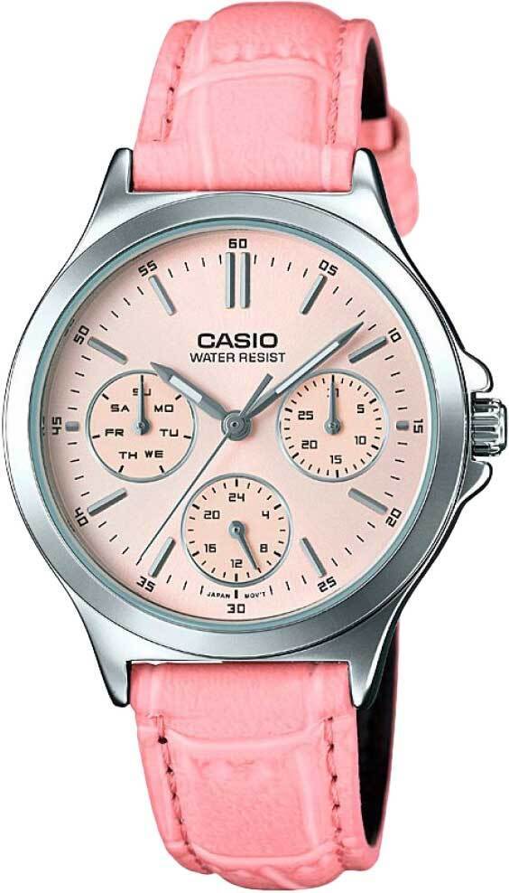 Женскиее кварцевые аналоговые наручные часы. Серия Casio Collection. Центральные часовая, минутная и секундная стрелки. Розовый циферблат с часовыми метками в виде штрихов. Стрелки с люминесцентным покрытием, которое светится в темноте после непродолжительного воздействия света. Малые циферблаты с указанием числа (в положении 3 ч), дня недели (в положении 9 ч) и суточного времени (в положении 6 ч). Устойчивое к мелким механическим повреждениям минеральное стекло. Круглый корпус размером 38 мм на 33,2 мм, толщиной 8,2 мм. Переводная головка с защитой. Розовый кожаный ремешок с классической застёжкой buckle. Батарейка рассчитана на 3 года. Водозащита 30WR (брызги). Вес около 62 г.