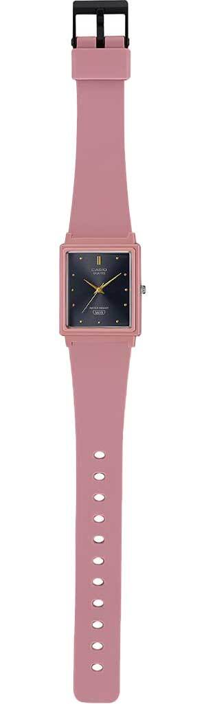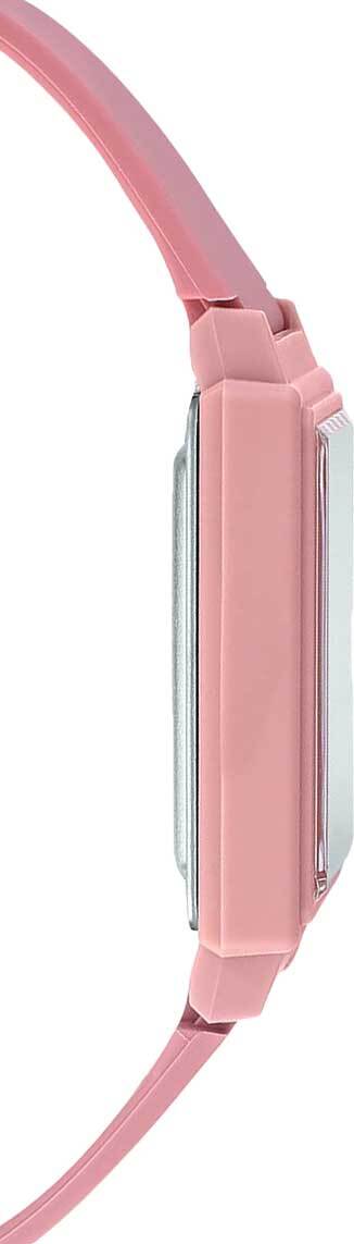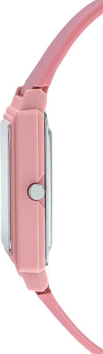 Женские кварцевые часы с аналоговым отображением времени. Центральные часовая, минутная и секундная стрелки золотистого цвета. Чёрный циферблат с часовыми метками в виде точек золотистого цвета. Пластиковое стекло. Прямоугольный корпус из полимерного пластика розового цвета. Размеры корпуса 37,2 мм на 26,5 мм, толщина 8,1 мм. Розовый пластиковый ремешок с классической застёжкой buckle. Стальная задняя крышка. Батарейка рассчитана на 2 года работы. Водонепроницаемость 30WR (защита от брызг). Вес около 19 г