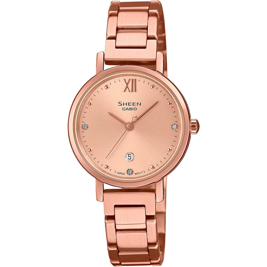 Женские аналоговые кварцевые часы. Коллекция Sheen. Центральные часовая, минутная и секундная стрелки. Розовый циферблат с часовыми метками в виде точек и римской цифры 12. Окошко даты в положении 6 ч. Циферблат украшен кристаллами. Круглый стальной корпус с покрытием цвета розового золота. Размер корпуса 28 мм на 34,5 мм, толщина 6.4 мм. Рифлёная переводная головка. Устойчивое к возникновению царапин сапфировое стекло. Стальной браслет с покрытием цвета розового золота. Водостойкость WR 50 (мытье рук, дождь). Вес примерно 60 г.