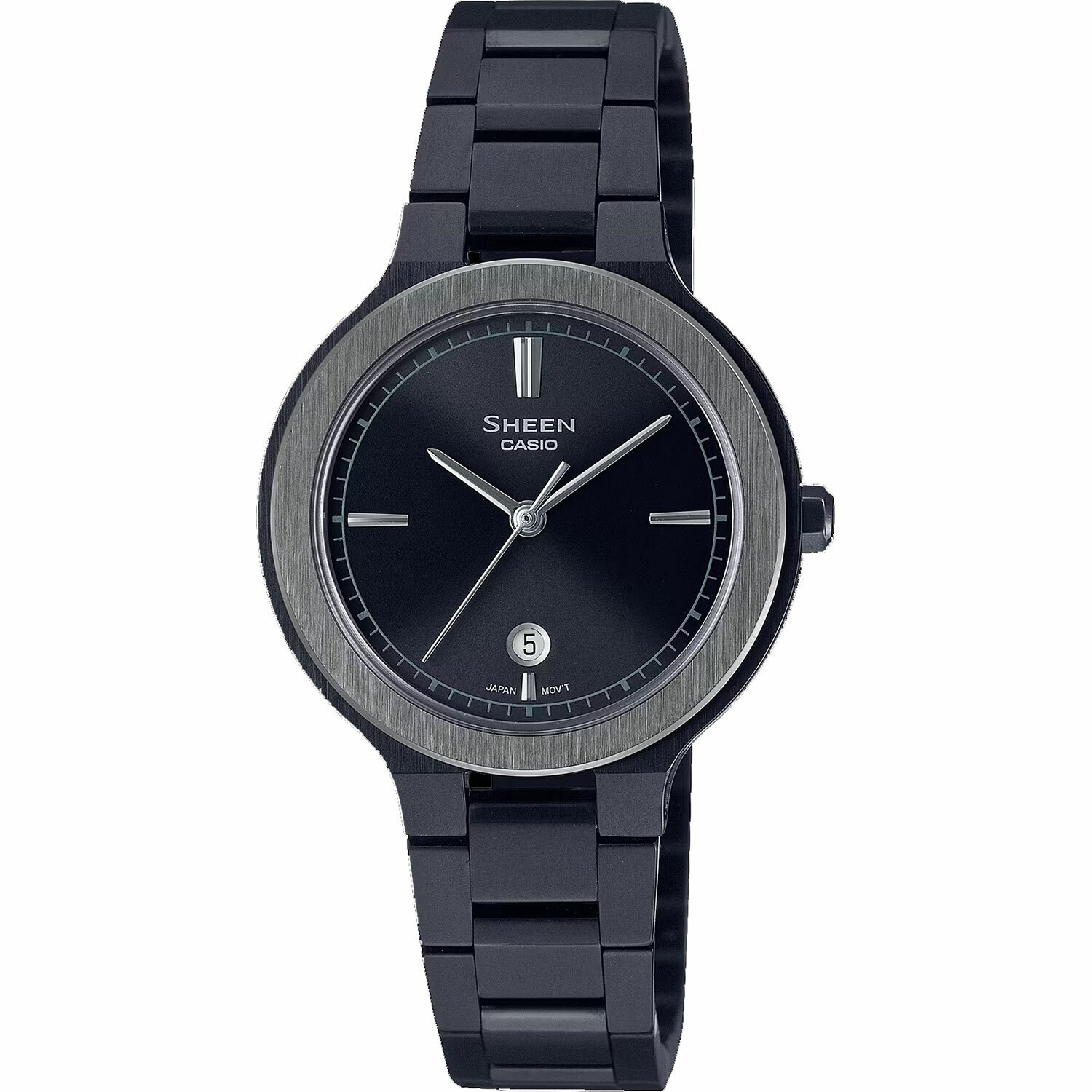 Женские кварцевые аналоговые наручные часы. Центральные часовая, минутная и секундная стрелки. Апертура даты в позиции 6 часов. Черный циферблат. Круглый корпус выполнен из нержавеющей стали с черным IP покрытием. Размер корпуса составляет 35 х 30 х 6,2 мм. Стальной браслет с покрытием, тройная раскладывающаяся застежка. Устойчивое к возникновению царапин сапфировое стекло. Водостойкость WR 50 (мытье рук, дождь). Вес примерно 60 г.