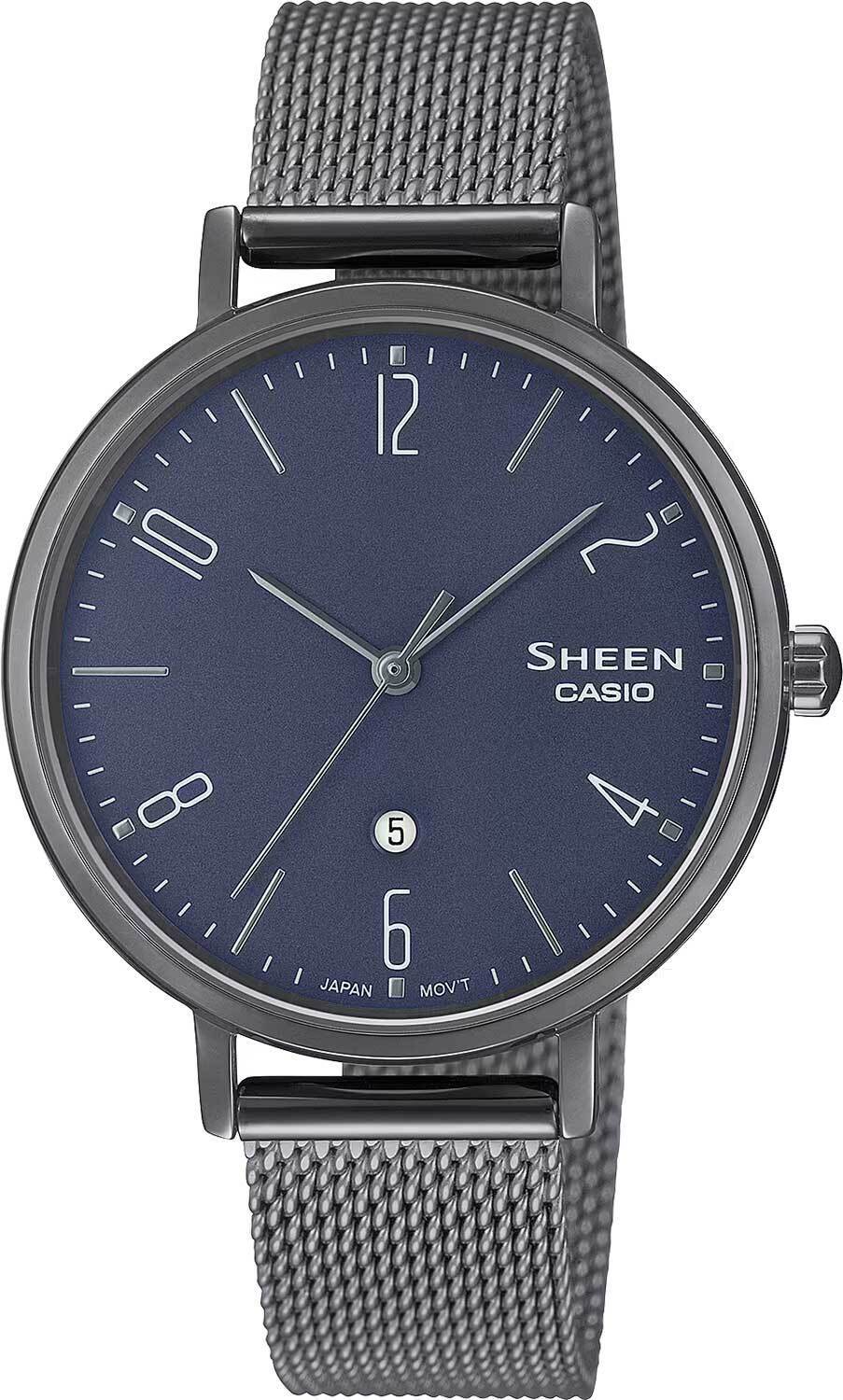 Женские аналоговые кварцевые часы. Коллекция Sheen. Центральные часовая, минутная и секундная стрелки. Синий циферблат с часовыми метками в виде штрихов и арабских цифр. Окошко даты в позиции 6 ч. Круглый стальной корпус с покрытием серого цвета. Размер корпуса 34x40,5мм, толщина 6,4мм. Рифлёная переводная головка. Устойчивое к возникновению царапин сапфировое стекло. Стальной браслет миланского плетения с покрытием серого цвета, регулируемая застежка. Водостойкость WR 50 (мытье рук, дождь). Вес примерно 48 г.
