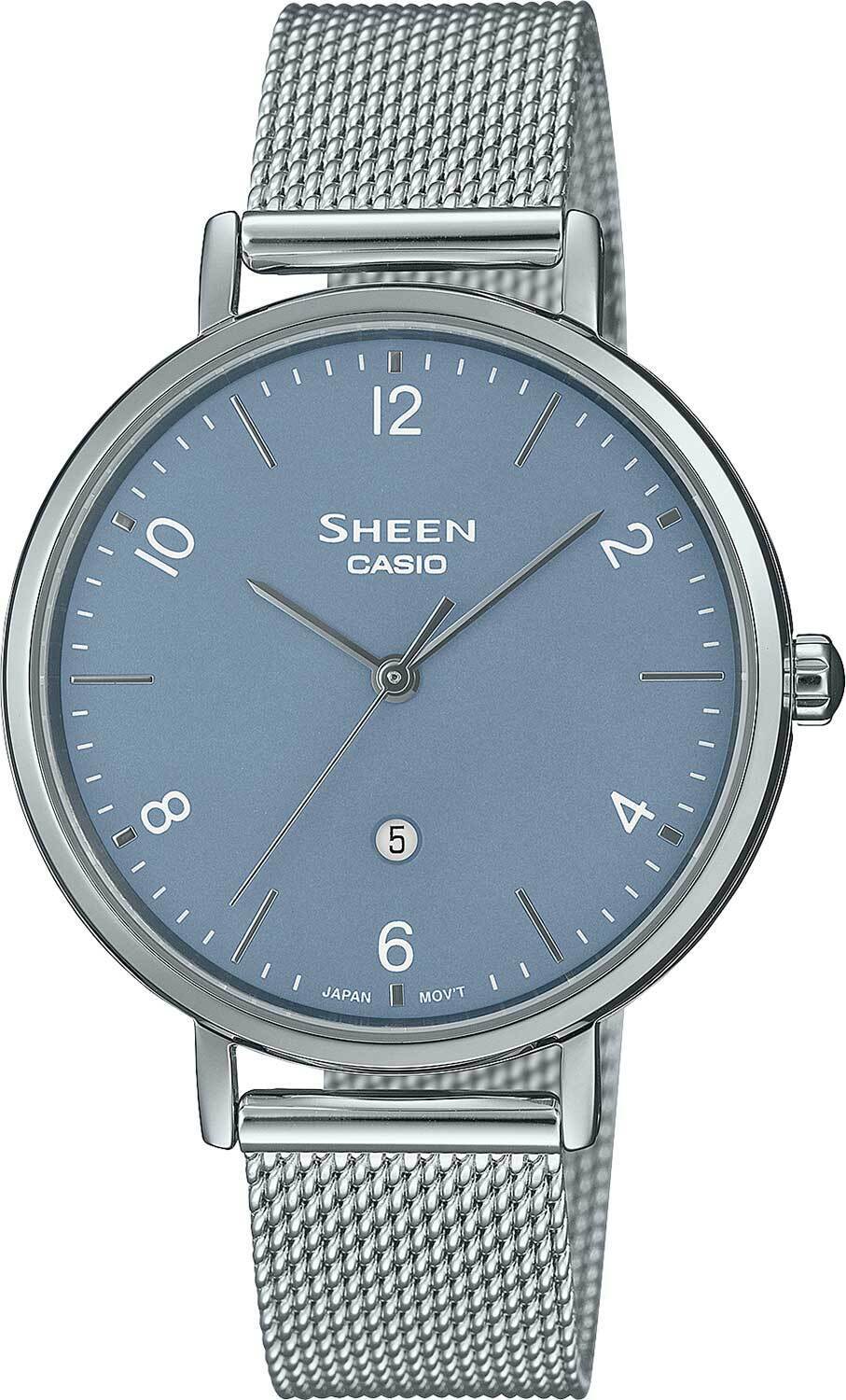 Женские кварцевые аналоговые часы. Коллекция Sheen. Центральные часовая, минутная и секундная стрелки. Голубой циферблат с часовыми метками в виде штрихов и арабских цифр. Окошко даты в положении 6 ч. Круглый стальной корпус. Размеры корпуса 34 мм на 40,5 мм, толщина 6,4 мм. Устойчивое к возникновению мелких царапин сапфировое стекло. Браслет миланского плетения из нержавеющей стали, регулируемая застежка. Водозащита WR50 (мытьё рук, дождь). Вес около 48 г.