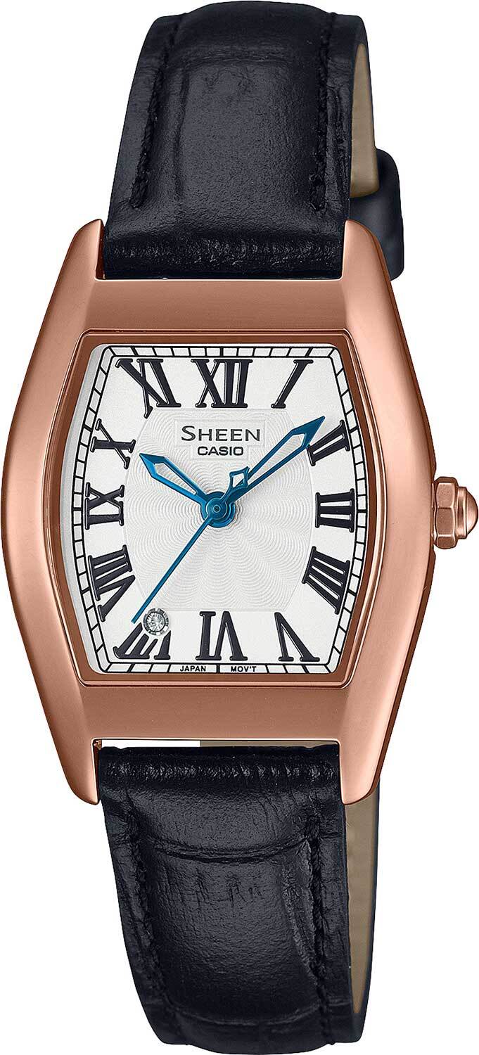 Женские кварцевые наручные часы c аналоговым отображением времени. Серия Sheen. Центральные часовая, минутная и секундная стрелки синего цвета. Белый циферблат с часовыми метками в виде римских цифр. Циферблат украшен кристаллом. Корпус из нержавеющей стали с IP покрытием цвета розового золота. Размер корпуса 34 мм на 25 мм, толщина 7,9 мм. Рифлёная переводная головка. Устойчивое к возникновению мелких царапин сапфировое стекло сферической формы. Чёрный кожаный ремешок с классической застёжкой buckle. Батарейка рассчитана на 3 года. Водонепроницаемость 50WR (мытьё рук, дождь). Вес около 27 г.