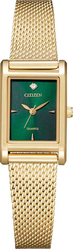 Женские кварцевые аналоговые наручные часы. Центральные часовая, минутная и секундная стрелки золотистого цвета. Зелёный циферблат с часовыми метками в виде штрихов. Циферблат украшен кристаллом. Прямоугольный стальной корпус с покрытием цвета жёлтого золота. Устойчивое к мелким механическим повреждениям минеральное стекло. Браслет миланского плетения из нержавеющей стали с покрытием цвета жёлтого золота. Водозащита WR 50 (мытьё рук, дождь). Вес примерно 31 г.