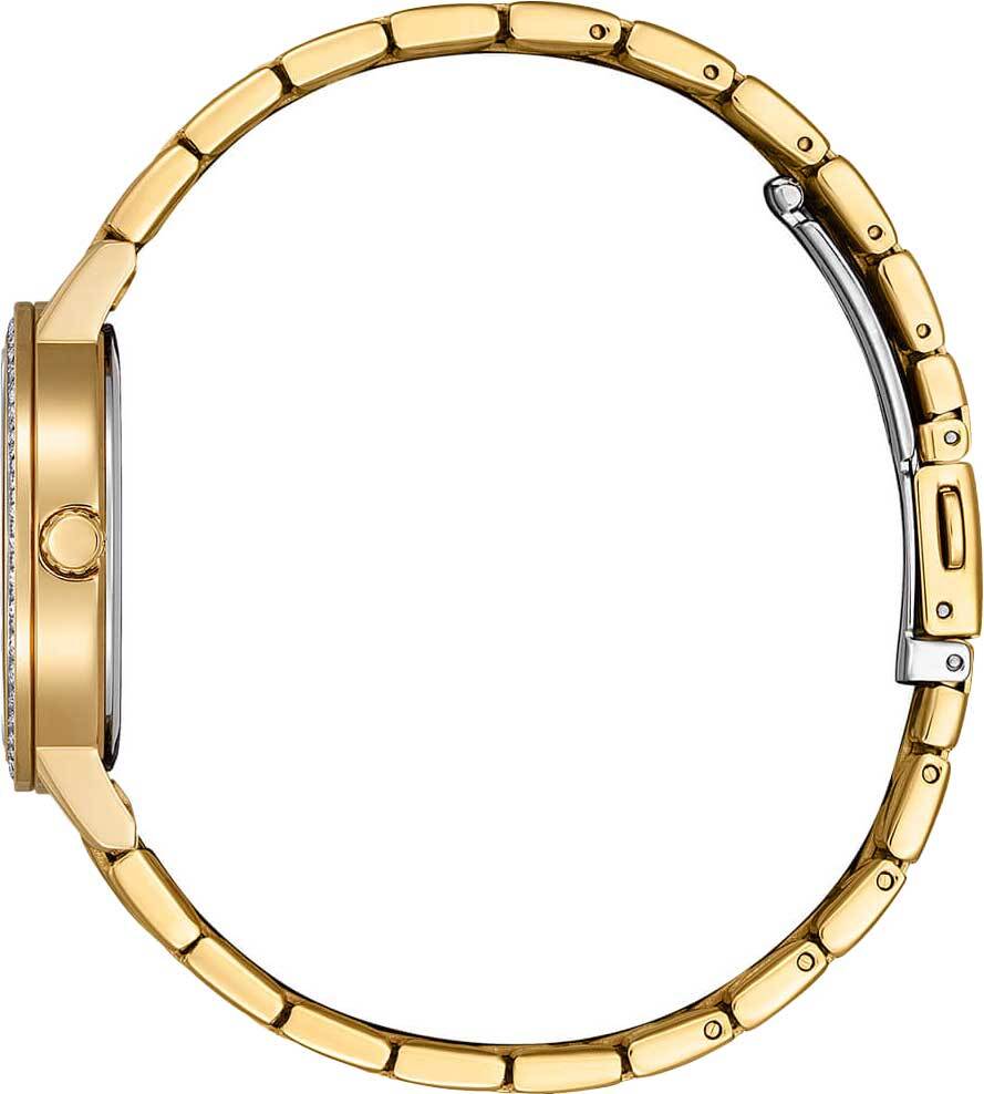 Женские кварцевые наручные часы с аналоговым отображением времени. Коллекция Eleganc. Калибр механизма Citizen 1032. Центральные часовая, минутная и секундная стрелки золотистого цвета. Перламутровый циферблат с часовыми метками в виде штрихов, точек и арабских цифр 6 и 12. Круглый корпус из нержавеющей стали с IP покрытием цвета розового золота. Диаметр корпуса 31 мм, толщина 7 мм. Безель украшен кристаллами. Устойчивое к мелким механическим повреждениям минеральное стекло. Браслет из нержавеющей стали с IP покрытием цвета розового золота, раскладывающаяся застежка. Водонепроницаемость 50WR (мытьё рук, дождь). Вес около 65 г.