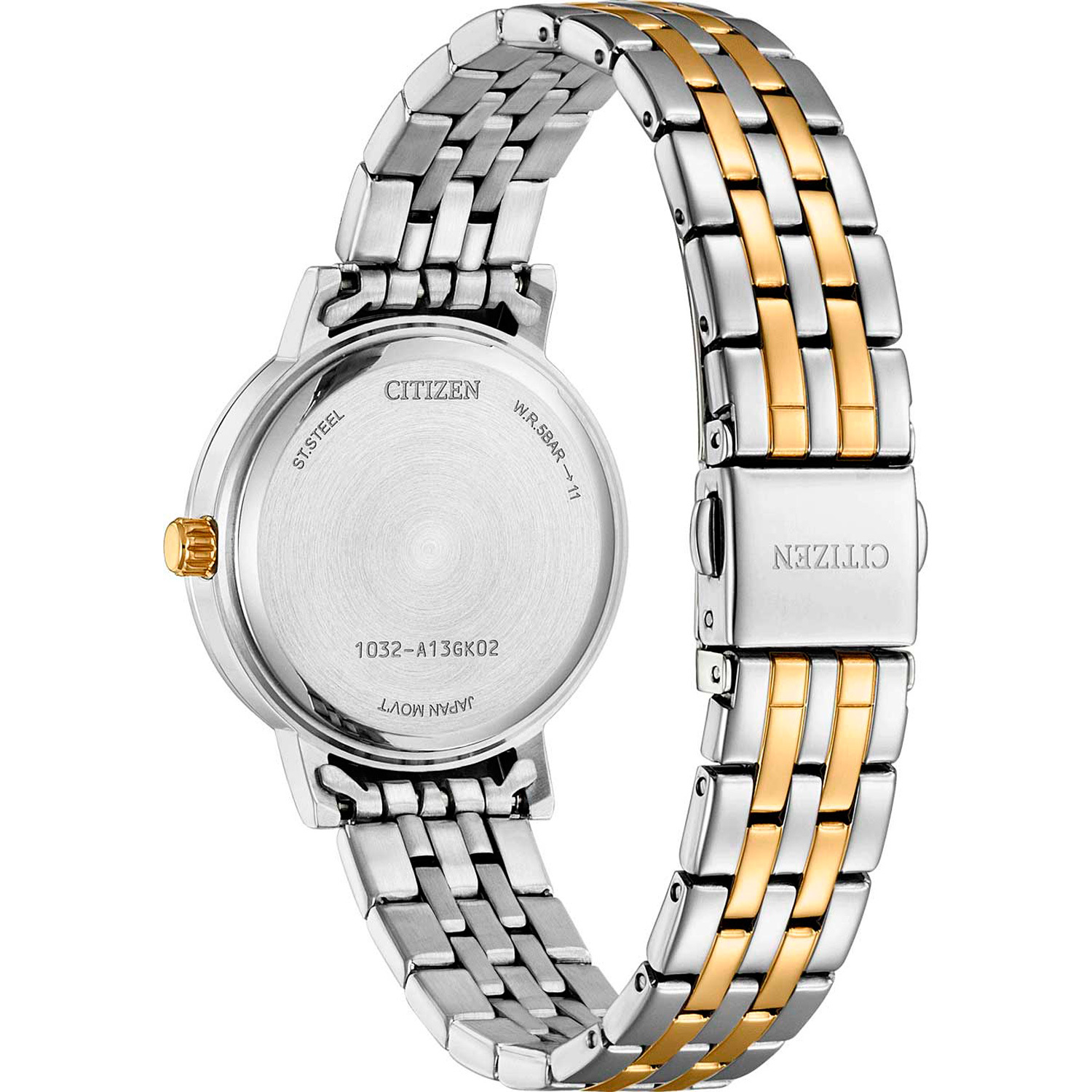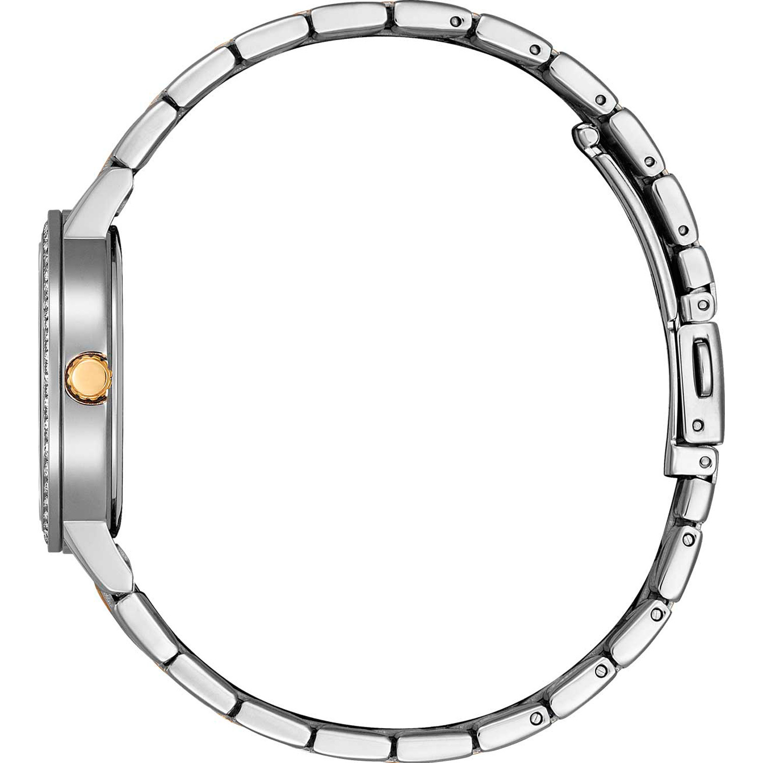 Женские кварцевые наручные часы с аналоговым отображением времени. Коллекция Eleganc. Калибр механизма Citizen 1032. Центральные часовая, минутная и секундная стрелки золотистого цвета. Синий циферблат с часовыми метками в виде штрихов, точек и арабских цифр 6 и 12. Круглый корпус из нержавеющей стали. Диаметр корпуса 31 мм, толщина 7 мм. Безель украшен кристаллами. Устойчивое к мелким механическим повреждениям минеральное стекло. Браслет из нержавеющей стали с частичным IP покрытием цвета розового золота, раскладывающаяся застежка. Водонепроницаемость 50WR (мытьё рук, дождь). Вес около 65 г.