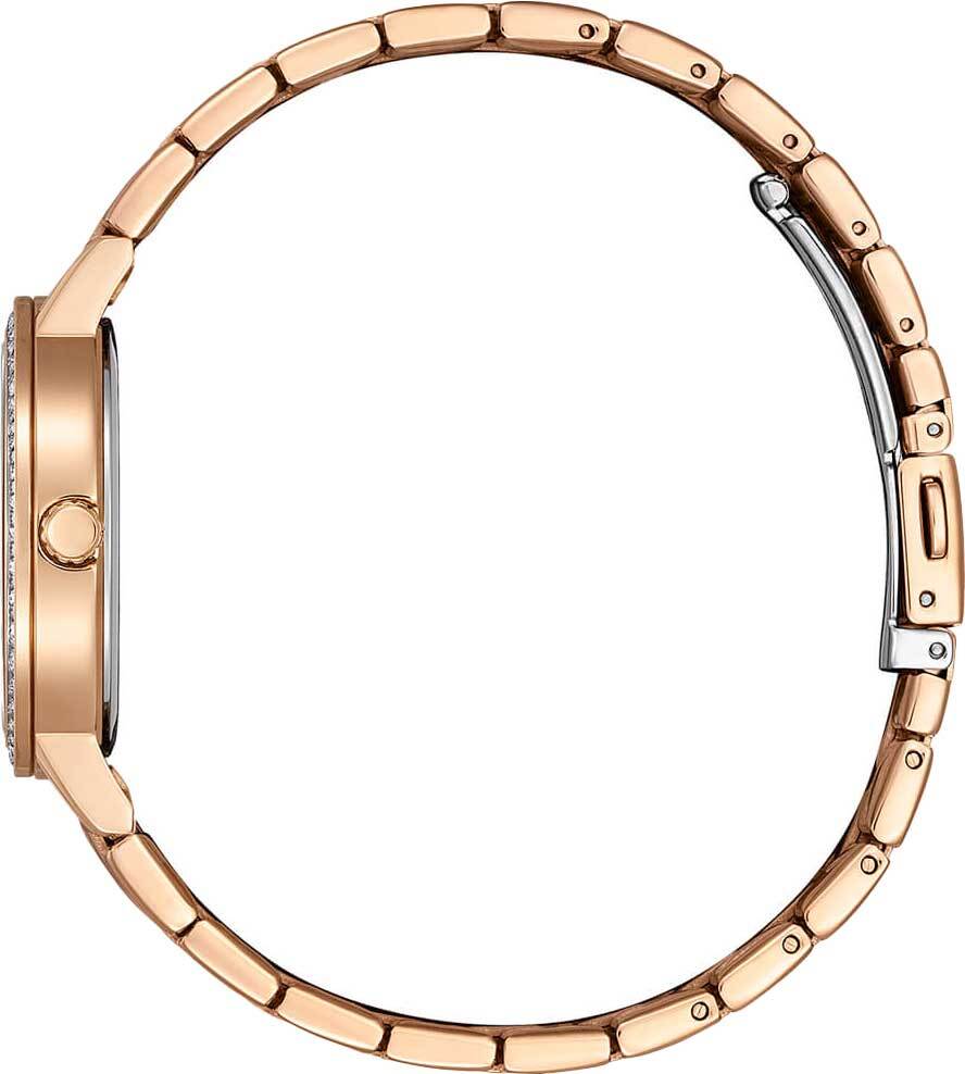 Женские кварцевые наручные часы с аналоговым отображением времени. Коллекция Eleganc. Калибр механизма Citizen 1032. Центральные часовая, минутная и секундная стрелки золотистого цвета. Перламутровый циферблат с часовыми метками в виде точек и арабской цифры 12. Круглый корпус из нержавеющей стали с IP покрытием цвета розового золота. Диаметр корпуса 31 мм, толщина 7 мм. Безель украшен кристаллами. Устойчивое к мелким механическим повреждениям минеральное стекло. Браслет из нержавеющей стали с IP покрытием цвета розового золота, раскладывающаяся застежка. Водонепроницаемость 50WR (мытьё рук, дождь). Вес около 65 г.