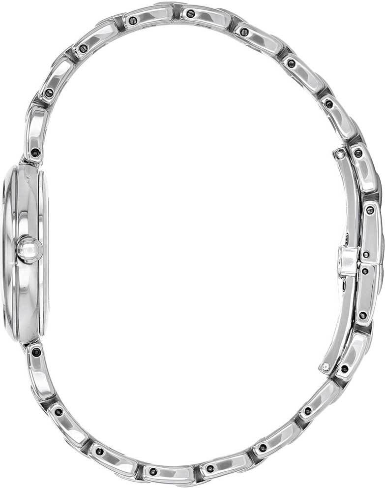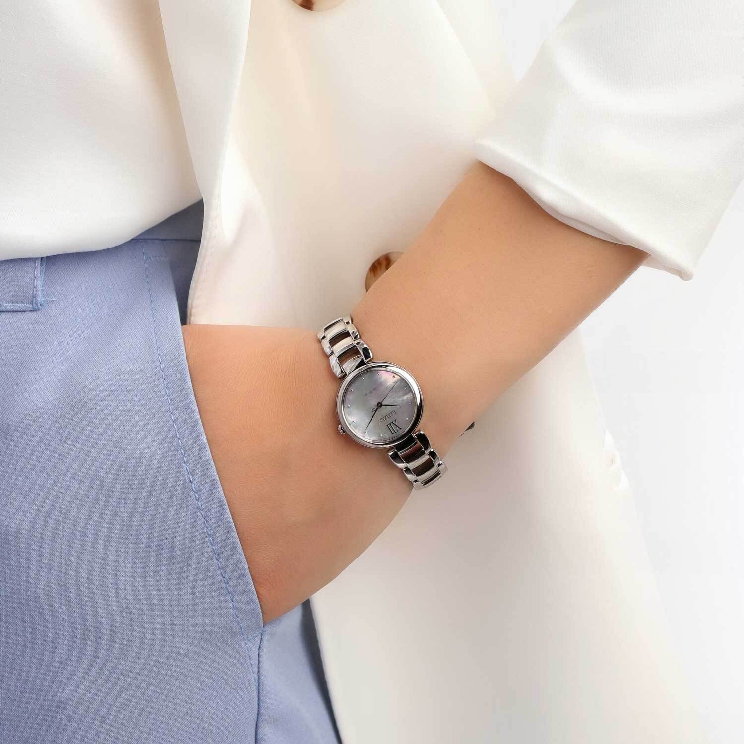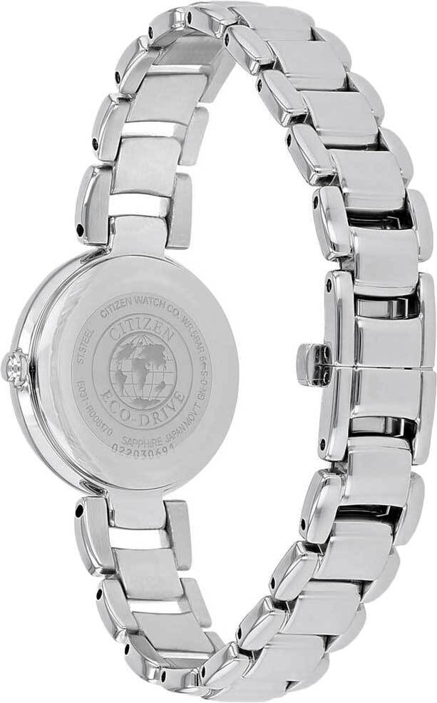Женские кварцевые аналоговые наручные часы на солнечной батарее. Коллекция Eco-Drive Elegance. Калибр механизма Citizen E031. Питание от солнечной энергии - часы оснащены системой Eco-Drive не требующей замены элемента питания. Система Eco-Drive - патентованная технология Citizen, заключающаяся в размещении фотоэлементов скрытых под циферблатом и постоянно заряжающих аккумулятор часов при попадании солнечного света на циферблат. Запас хода до 180 дней от полностью заряженной батареи. Функция индикации заряда (EOL - End of Life) – в случае ослабевания заряда элемента питания секундная стрелка перемещается с интервалом в 2 секунды. Функция предотвращения перезарядки. Центральные часовая, минутная и секундная стрелки. Перламутровый циферблат с часовыми метками в виде точек и римской цифры XII. Круглый стальной корпус диаметром 28,7 мм, толщиной 7,8 мм. Устойчивое к возникновению мелких царапин сапфировое стекло. Стальной браслет с раскладывающейся застежкой. Водонепроницаемость 50WR (мытьё рук, дождь). Вес около 63 г.