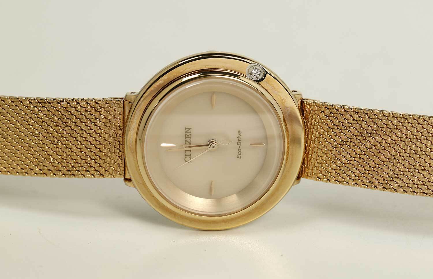 Женские кварцевые аналоговые наручные часы. Коллекция Elegance. Калибр механизма E031. Часы оснащены системой питания и подзарядки от солнечного света Eco-Drive не требующей замены батарейки. Система Eco-Drive - патентованная технология компании Citizen заключающаяся в размещении фотоэлементов под циферблатом и постоянно подзаряжающих аккумулятор часов при попадании солнечного света на циферблат. Система предупреждения о низком уровне заряда аккумулятора и предотвращения перезарядки. Запас хода при полной зарядке аккумулятора около 180 дней. Функция индикации заряда (EOL - End of Life – в случае, если заряд элемента питания ослабевает, секундная стрелка начинает двигаться через деления). Центральные часовая, минутная и секундная стрелки золотистого цвета. Белый перламутровый циферблат с часовыми метками в виде штрихов. Круглый стальной корпус с покрытием цвета розового золота. Безель украшен кристаллом. Диаметр корпуса 31,5 мм, толщина 8,5 мм. Устойчивое к мелким царапинам сапфировое стекло. Стальной браслет миланского плетения с покрытием цвета розового золота. Водозащита WR 50 (мытьё рук, дождь). Вес примерно 52 г.