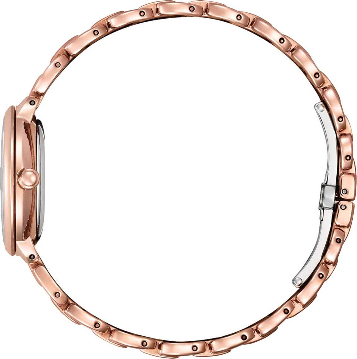 Женские кварцевые аналоговые наручные часы. Серия Eco-Drive. Калибр механизма E031. Часы оснащены системой питания и подзарядки от солнечного света Eco-Drive не требующей замены батарейки. Система Eco-Drive - патентованная технология компании Citizen заключающаяся в размещении фотоэлементов под циферблатом и постоянно подзаряжающих аккумулятор часов при попадании солнечного света на циферблат. Система предупреждения о низком уровне заряда аккумулятора и предотвращения перезарядки. Запас хода при полной зарядке аккумулятора около 180 дней. Функция индикации заряда (EOL - End of Life – в случае, если заряд элемента питания ослабевает, секундная стрелка начинает двигаться через 2 деления). Центральные часовая, минутная и секундная стрелки золотистого цвета. Перламутровый циферблат с часовыми метками в виде золотистых точек и 4-х римских цифр. Круглый стальной корпус с покрытием цвета розового золота. Диаметр корпуса 28 мм, толщина 8 мм. Устойчивое к мелким царапинам сапфировое стекло. Стальной браслет с покрытием цвета розового золота, раскладывающаяся застежка. Водозащита WR 50 (мытьё рук, дождь). Вес примерно 68 г.