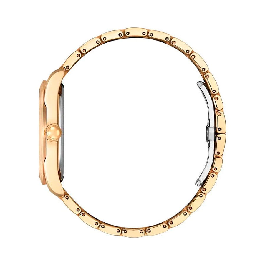 Женские кварцевые аналоговые наручные часы. Часы оснащенный системой питания и подзарядки от солнечного света Eco-Drive не требующей замены батарейки. Система Eco-Drive - патентованная технология компании Citizen заключающаяся в размещении фотоэлементов скрытых под циферблатом и постоянно подзаряжающих аккумулятор часов при попадании солнечного света на циферблат. Система предупреждения о низком уровне заряда аккумулятора и предотвращения перезарядки. Запас хода при полной зарядке аккумулятора около 180 дней. Функция индикации заряда (EOL - End of Life) – в случае, если заряд элемента питания ослабевает, секундная стрелка начинает двигаться через 2 деления. Центральные часовая, минутная и секундная стрелки. Белый циферблат с часовыми метками в виде римских цифр. Круглый стальной корпус с покрытием цвета розового золота. Диаметр корпуса 34,8 мм, толщина 8 мм. Устойчивое к мелким царапинам сапфировое стекло. Браслет из нержавеющей стали с покрытием цвета розового золота. Водозащита WR 50 (мытьё рук, дождь). Вес примерно 80 г.
