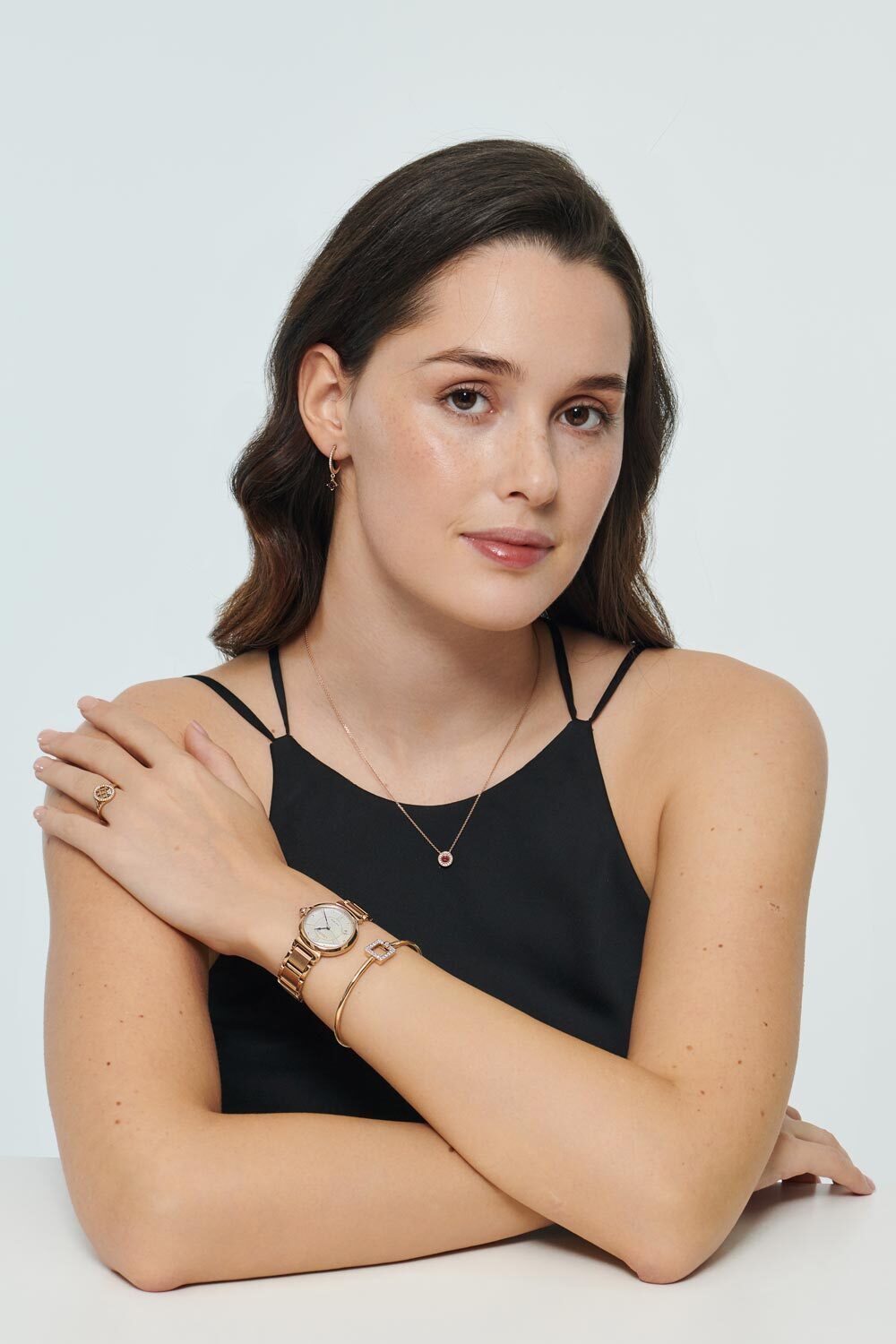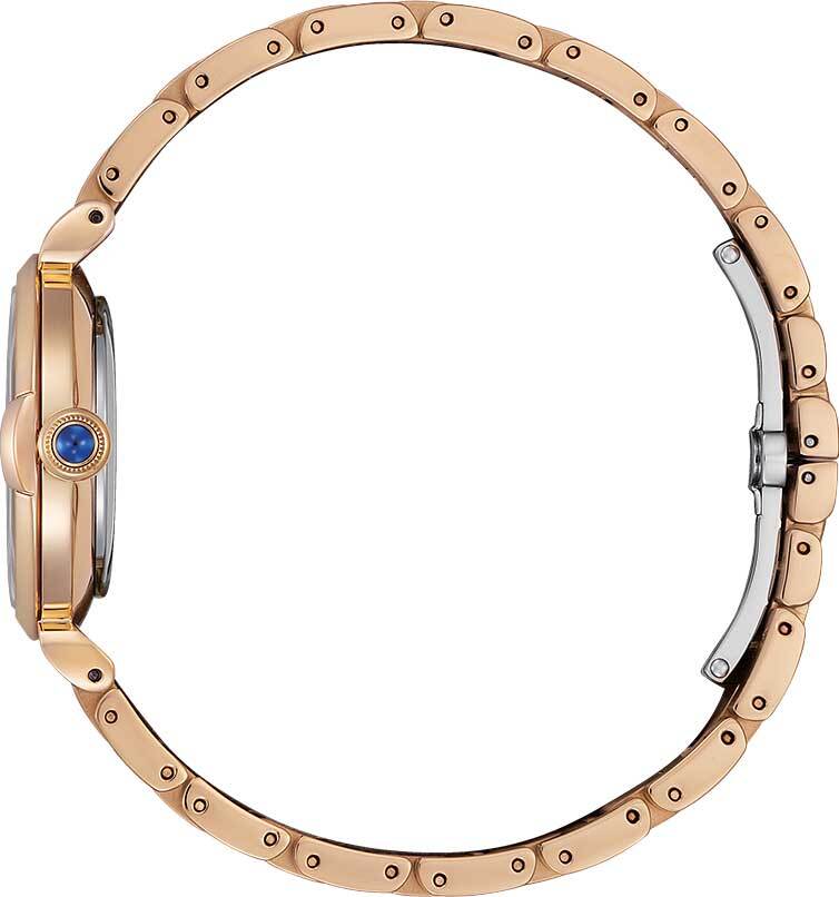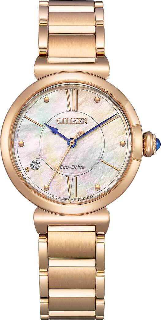 Женские кварцевые аналоговые наручные часы. Серия L May bells. Калибр механизма E031. Часы оснащены системой питания и подзарядки от солнечного света Eco-Drive не требующей замены батарейки. Система Eco-Drive - патентованная технология компании Citizen заключающаяся в размещении фотоэлементов под циферблатом и постоянно подзаряжающих аккумулятор часов при попадании солнечного света на циферблат. Система предупреждения о низком уровне заряда аккумулятора и предотвращения перезарядки. Запас хода при полной зарядке аккумулятора около 180 дней. Функция индикации заряда (EOL - End of Life – в случае, если заряд элемента питания ослабевает, секундная стрелка начинает двигаться через 2 деления). Центральные часовая, минутная и секундная стрелки. Перламутровый розовый циферблат с часовыми метками в виде золотистых точек, штрихов и 2-х римских цифр. Циферблат украшен кристаллом. Круглый стальной корпус с покрытием цвета розового золота. Диаметр корпуса 29,5 мм, толщина 8,3 мм. Устойчивое к мелким царапинам сапфировое стекло. Переводная головка украшена синим кристаллом в форме кабошона. Стальной браслет с покрытием цвета розового золота, раскладывающаяся застежка. Водозащита WR 50 (мытьё рук, дождь). Вес примерно 72 г.
