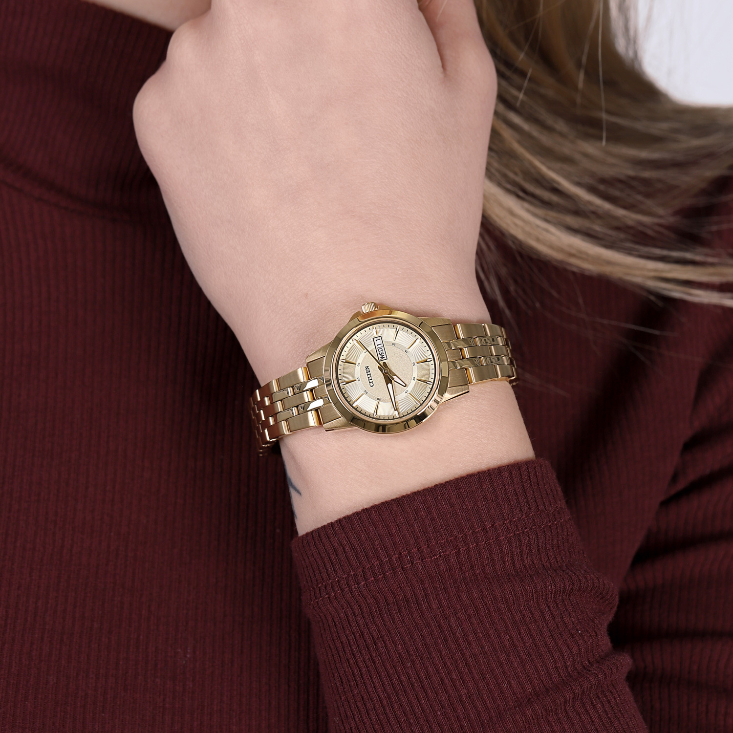Женские кварцевые наручные часы с аналоговым отображением времени. Коллекция Basic. Калибр механизма Citizen 1002. Центральные часовая, минутная и секундная стрелки. Жёлтый циферблат с часовыми метками в виде штрихов. Стрелки и часовые метки с люминесцентным покрытием, которое светится в темноте после непродолжительного воздействия света. Индикация даты и дня недели в позиции 3 ч. Минутная шкала на циферблате. Круглый стальной корпус с IP покрытием цвета жёлтого золота. Диаметр корпуса 41 мм, толщина 9 мм. Устойчивое к мелким механическим повреждениям минеральное стекло. Рифленая переводная головка с защитой. Стальной браслет с IP покрытием цвета жёлтого золота, раскладывающаяся застежка. Водонепроницаемость 30WR (защита от брызг). Вес около 60 г.