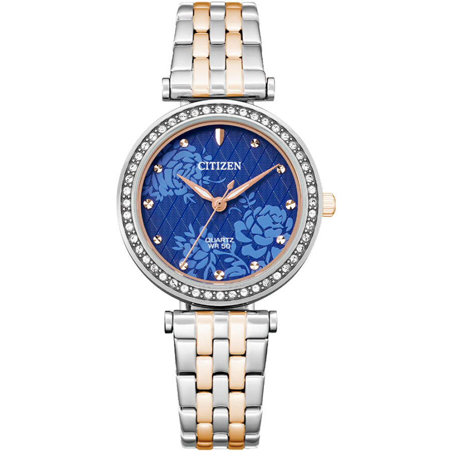 Женские кварцевые аналоговые наручные часы. Центральные часовая, минутная и секундная стрелки. Синий циферблат с рисунком в виде цветов и часовыми метками в виде точек. Круглый стальной корпус. Диаметр корпуса 30 мм, толщина 6,7 мм. Безель украшен кристаллами. Устойчивое к мелким механическим повреждениям минеральное стекло. Браслет из нержавеющей стали с частичным покрытием цвета жёлтого золота. Водозащита WR 50 (мытьё рук, дождь). Вес примерно 57 г.