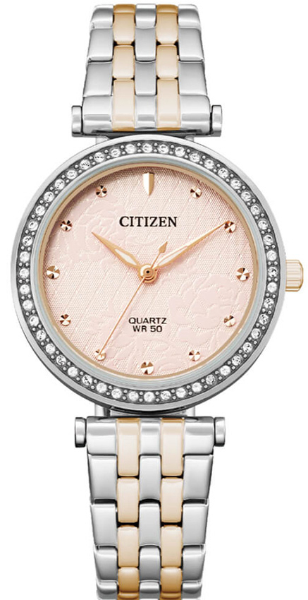 Женские кварцевые аналоговые наручные часы. Центральные часовая, минутная и секундная стрелки. Розовый циферблат с рисунком в виде цветов и часовыми метками в виде точек. Круглый стальной корпус. Диаметр корпуса 30 мм, толщина 6,7 мм. Безель украшен кристаллами. Устойчивое к мелким механическим повреждениям минеральное стекло. Браслет из нержавеющей стали с частичным покрытием цвета розового золота. Водозащита WR 50 (мытьё рук, дождь). Вес примерно 57 г.