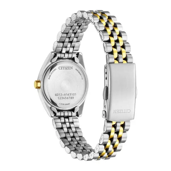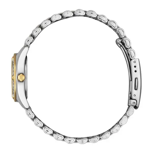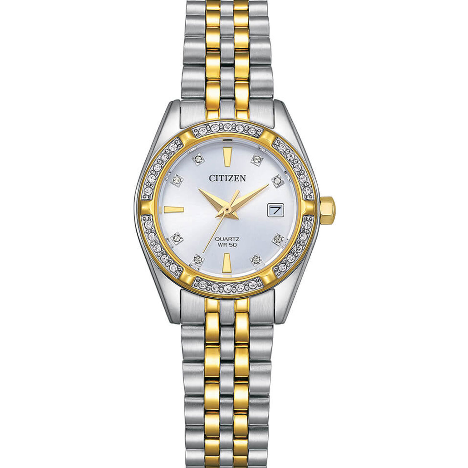 Женские кварцевые наручные часы с аналоговым отображением времени. Коллекция Quartz. Калибр механизма Citizen G011. Центральные часовая, минутная и секундная стрелки золотистого цвета. Серебристый циферблат с часовыми метками в виде штрихов и кристаллов. Индикация даты в позиции 3 ч. Стальной корпус диаметром 26 мм, толщиной 8 мм. Безель украшен кристаллами. Устойчивое к мелким механическим повреждениям минеральное стекло. Рифленая переводная головка. Стальной браслет с частичным IP покрытием цвета жёлтого золота, раскладывающаяся застежка. Водонепроницаемость 50WR (мытьё рук, дождь).