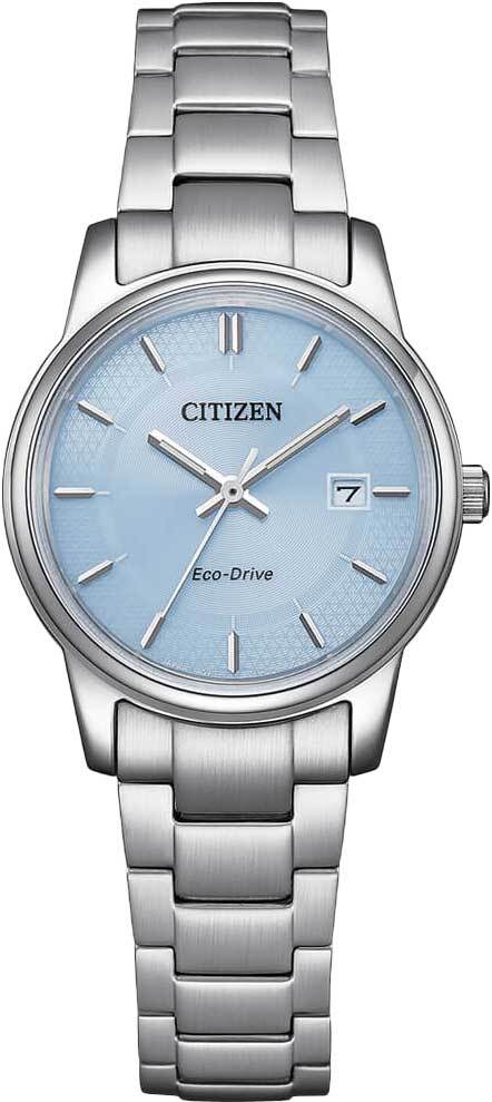 Женские кварцевые аналоговые наручные часы на солнечной батарее. Коллекция Eco-Drive Elegance. Калибр механизма Citizen E011. Питание от солнечной энергии - часы оснащены системой Eco-Drive не требующей замены батарейки. Система Eco-Drive - патентованная технология Citizen, заключающаяся в размещении фотоэлементов скрытых под циферблатом и постоянно заряжающих аккумулятор часов при попадании солнечного света на циферблат. Запас хода до 180 дней от полностью заряженной батареи. Функция индикации заряда (EOL - End of Life) – в случае ослабевания заряда элемента питания секундная стрелка перемещается через 2 деления. Функция предотвращения перезарядки. Центральные часовая, минутная и секундная стрелки. Голубой циферблат с часовыми метками в виде штрихов. Индикация даты в позиции 3 часов. Круглый корпус из нержавеющей стали диаметром 27,5 мм, толщиной 7,4 мм. Устойчивое к возникновению мелких царапин сапфировое стекло. Стальной браслет с раскладывающейся застежкой. Водонепроницаемость 50WR (мытьё рук, дождь). Вес около 57 г.