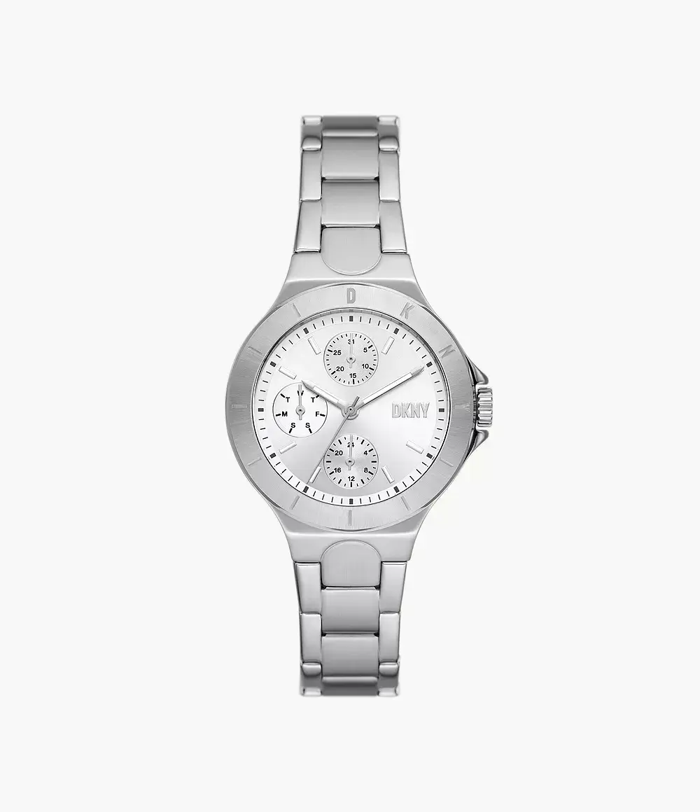 Женские кварцевые аналоговые наручные часы. Коллекция Chambers. Центральные часовая, минутная и секундная стрелки. Серебристый циферблат с часовыми метками в виде штрихов. Стрелки и метки с люминесцентным покрытием, которое светится в темноте после непродолжительного воздействия света. 12-ти и 24-х часовой формат отображения времени. Время в 24-х часовом формате, дата и день недели вынесены на отдельные малые циферблаты . Круглый стальной корпус диаметром 34 мм. Устойчивое к мелким механическим повреждениям минеральное стекло. Рифлёная переводная головка с защитой. Стальной браслет с раскладывающейся застежкой с 2 кнопками. Водозащищённость 30WR (брызги).