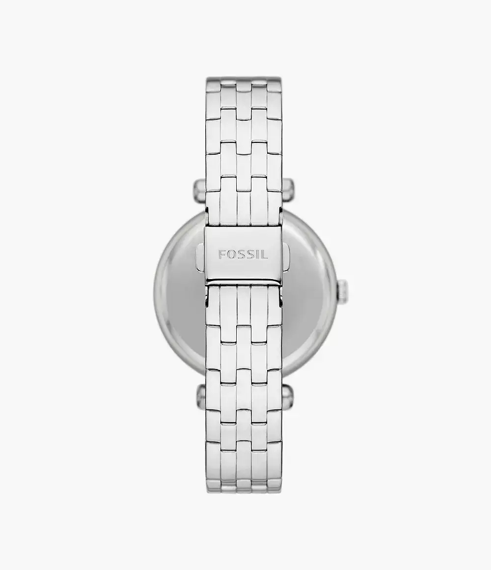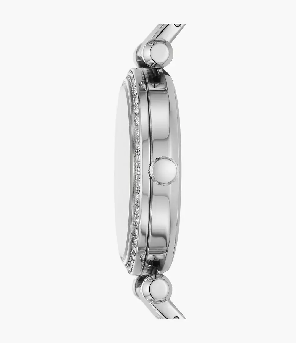 Женские аналоговые наручные часы. Коллекция TILLIE. Питание от солнечной энергии. Круглый стальной корпус, серебристый циферблат. Центральные часовая, минутная и секундная стрелки. Безель украшен кристаллами. Стальной браслет. Водостойкость WR 50.