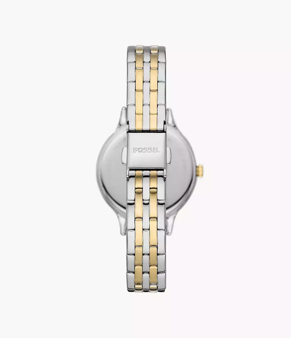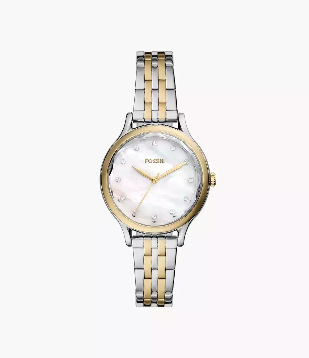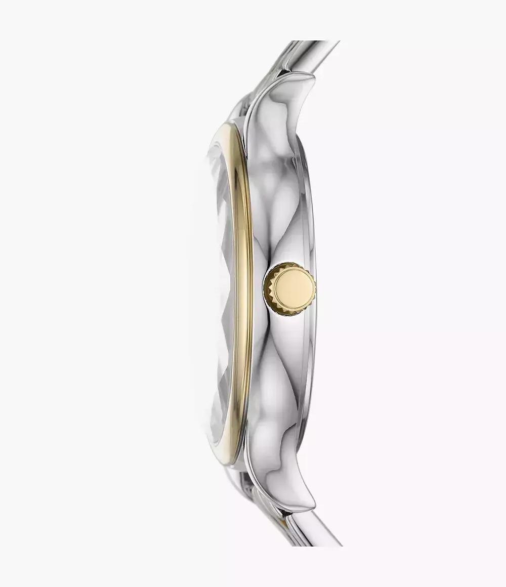 Женские кварцевые аналоговые наручные часы. Коллекция LANEY. Круглый стальной корпус, перламутровый циферблат. Циферблат украшен кристаллами. Центральные часовая, минутная и секундная стрелки. Безель цвета жёлтого золота. Устойчивое к царапинам минеральное стекло. Стальной браслет с частичным IP-покрытием цвета жёлтого золота. Водостойкость WR 50.