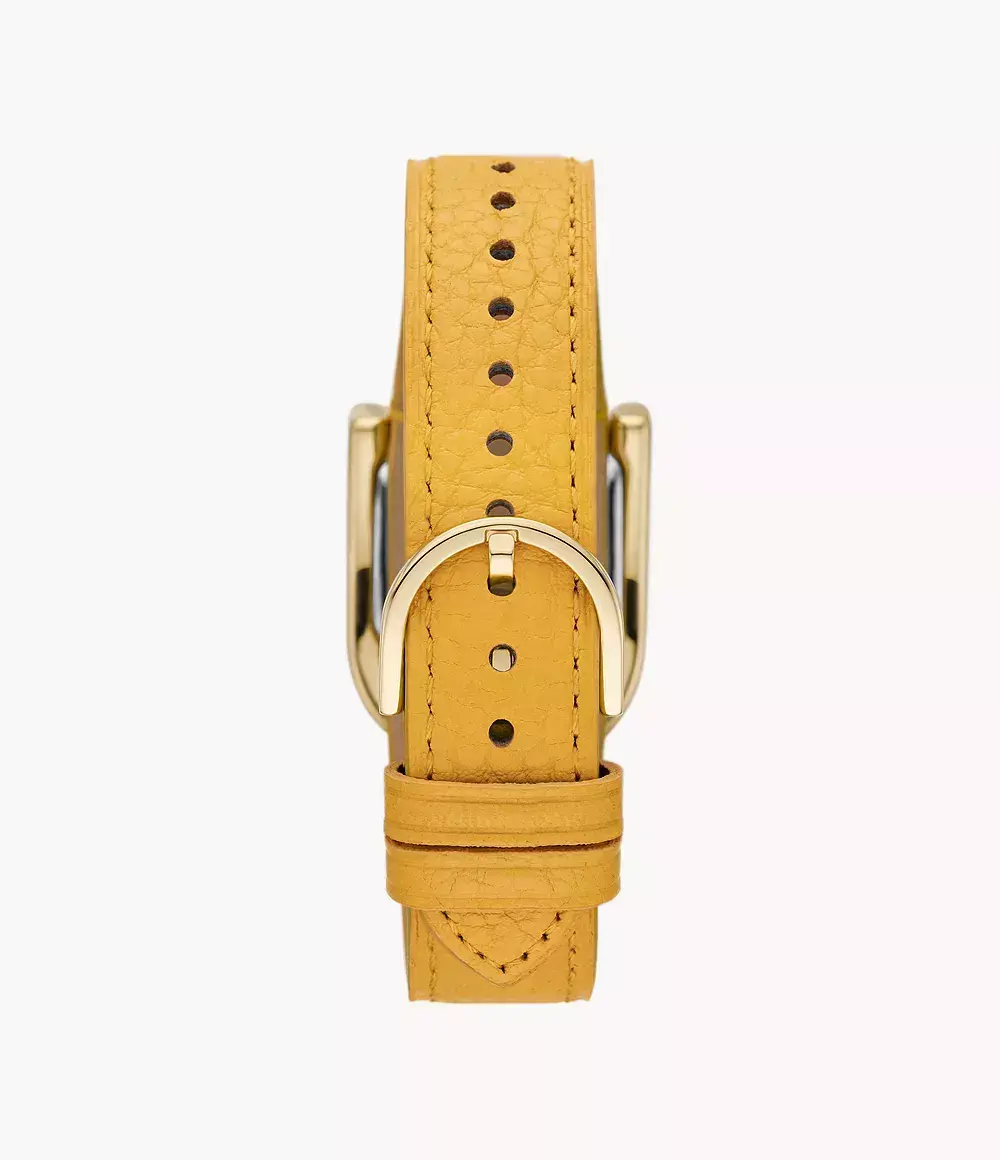 Женские кварцевые аналоговые наручные часы. Коллекция Fossil Harwell. Центральные часовая, минутная и секундная стрелки. На стрелки нанесено люминесцентное покрытие (светятся в темноте после нахождения на свету). Рифлёная переводная головка в положении 12 ч. Прямоугольный корпус из нержавеющей стали с PVD-покрытием цвета розового золота. Циферблат бежевого цвета. Устойчивое к мелким механическим повреждения минеральное стекло. Кожаный ремешок жёлтого цвета. Водостойкость WR 30 брызги).
