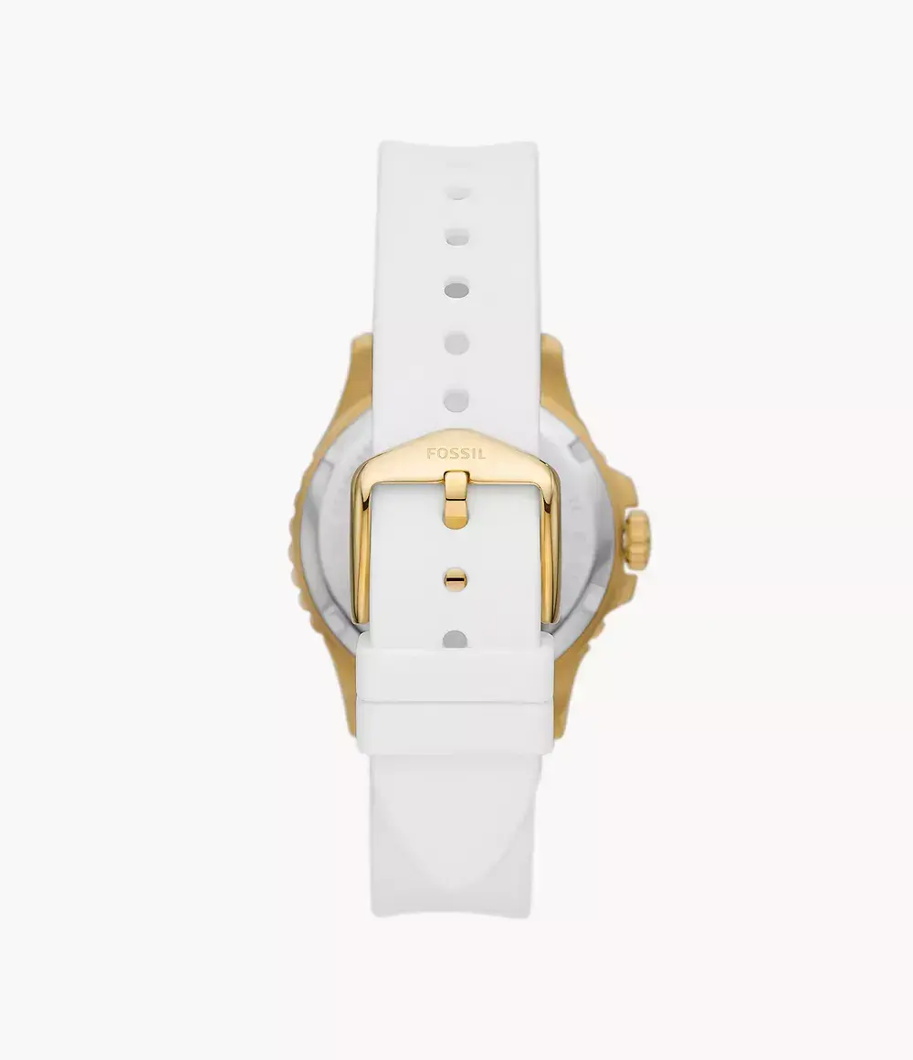 Женские кварцевые аналоговые наручные часы. Коллекция Fossil FB-01. Центральные часовая, минутная и секундная стрелки. На стрелки нанесено люминесцентное покрытие (светятся в темноте после нахождения на свету). Индикация даты в положении 3 ч. Круглый корпус из нержавеющей стали с PVD-покрытием цвета жёлтого золота. Диаметр корпуса 36 мм. Циферблат белого цвета украшен кристаллами. Устойчивое к мелким механическим повреждения минеральное стекло. Пластиковый ремешок белого цвета. Водостойкость WR 100 (плавание и ныряние без акваланга).