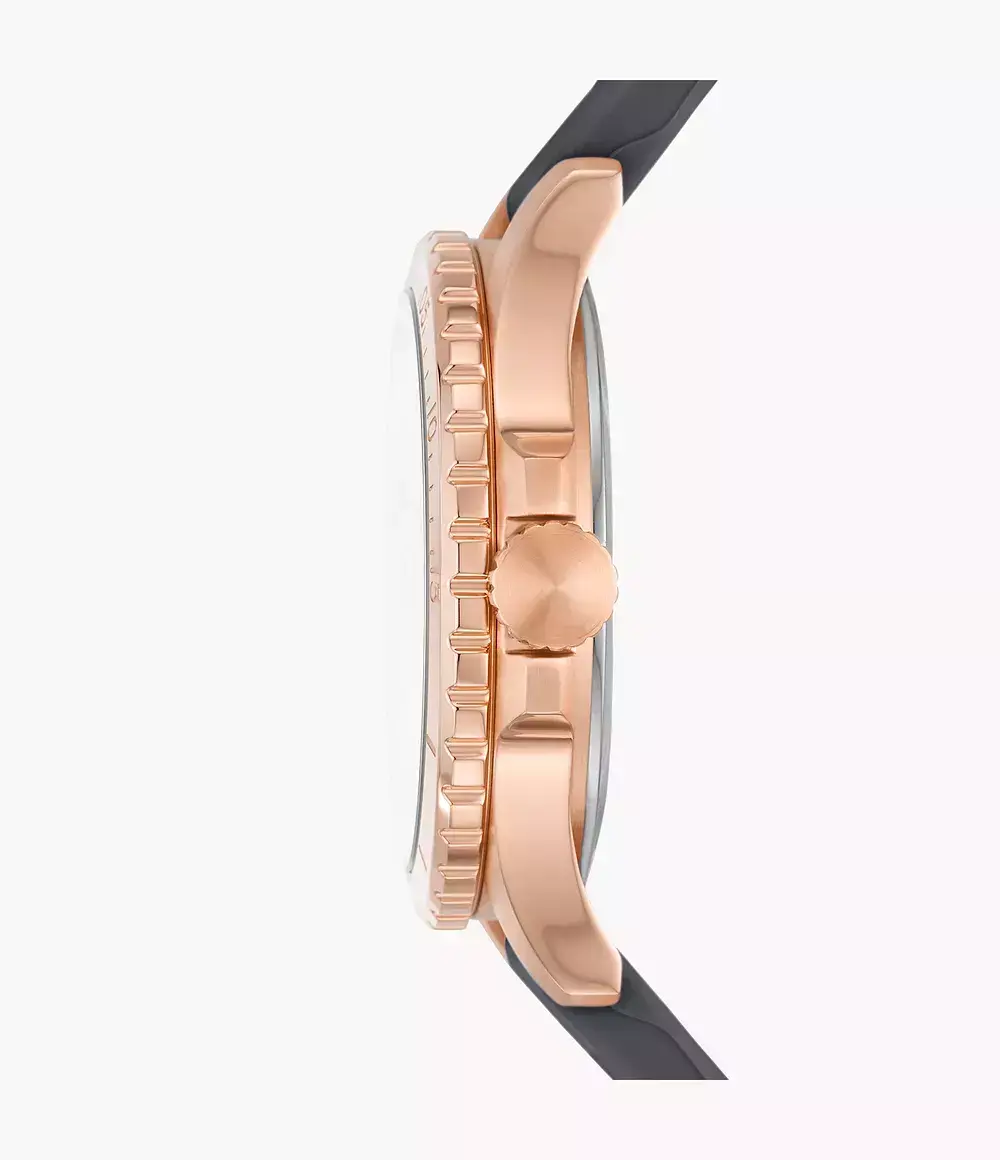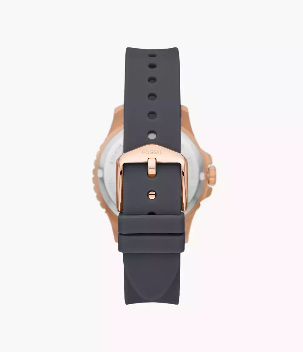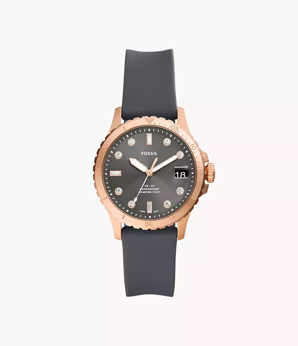 Женские кварцевые аналоговые наручные часы. Коллекция Fossil FB-01. Центральные часовая, минутная и секундная стрелки. На стрелки нанесено люминесцентное покрытие (светятся в темноте после нахождения на свету). Индикация даты в положении 3 ч. Круглый корпус из нержавеющей стали с PVD-покрытием цвета розового золота.. Диаметр корпуса 36 мм. Циферблат серого цвета украшен кристаллами. Устойчивое к мелким механическим повреждения минеральное стекло. Пластиковый ремешок серого цвета. Водостойкость WR 100 (плавание и ныряние без акваланга).
