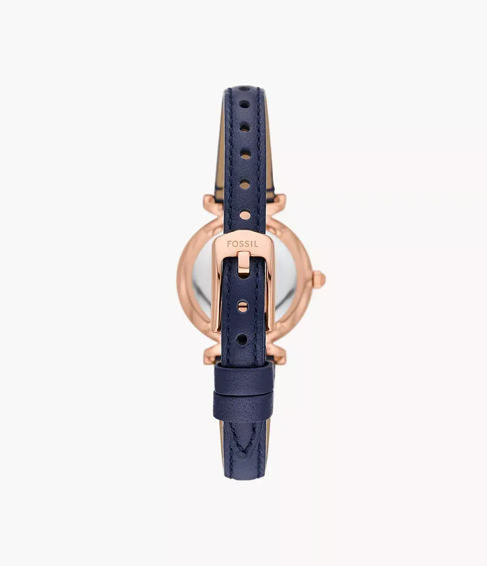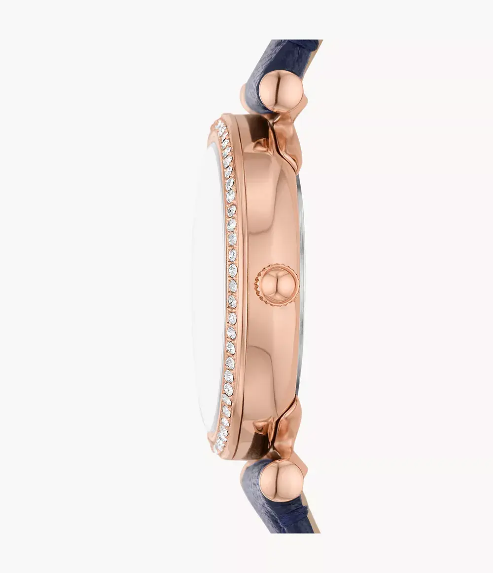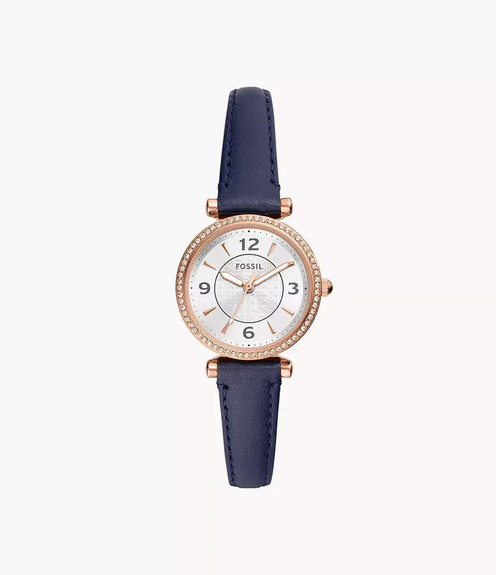 Женские кварцевые аналоговые наручные часы. Коллекция Carlie. Центральные часовая, минутная и секундная стрелки. Серебристый циферблат с часовыми метками в виде штрихов и четырёх арабских цифр. Стрелки с люминесцентным покрытием, которое светится в темноте после непродолжительного воздействия света. Круглый стальной корпус с покрытием цвета розового золота. Диаметр корпуса 28 мм. Безель украшен кристаллами. Устойчивое к мелким механическим повреждениям минеральное стекло. Рифлёная переводная головка. Синий кожаный ремешок с классической застёжкой buckle. Водозащищённость 50WR (мытьё рук, дождь).