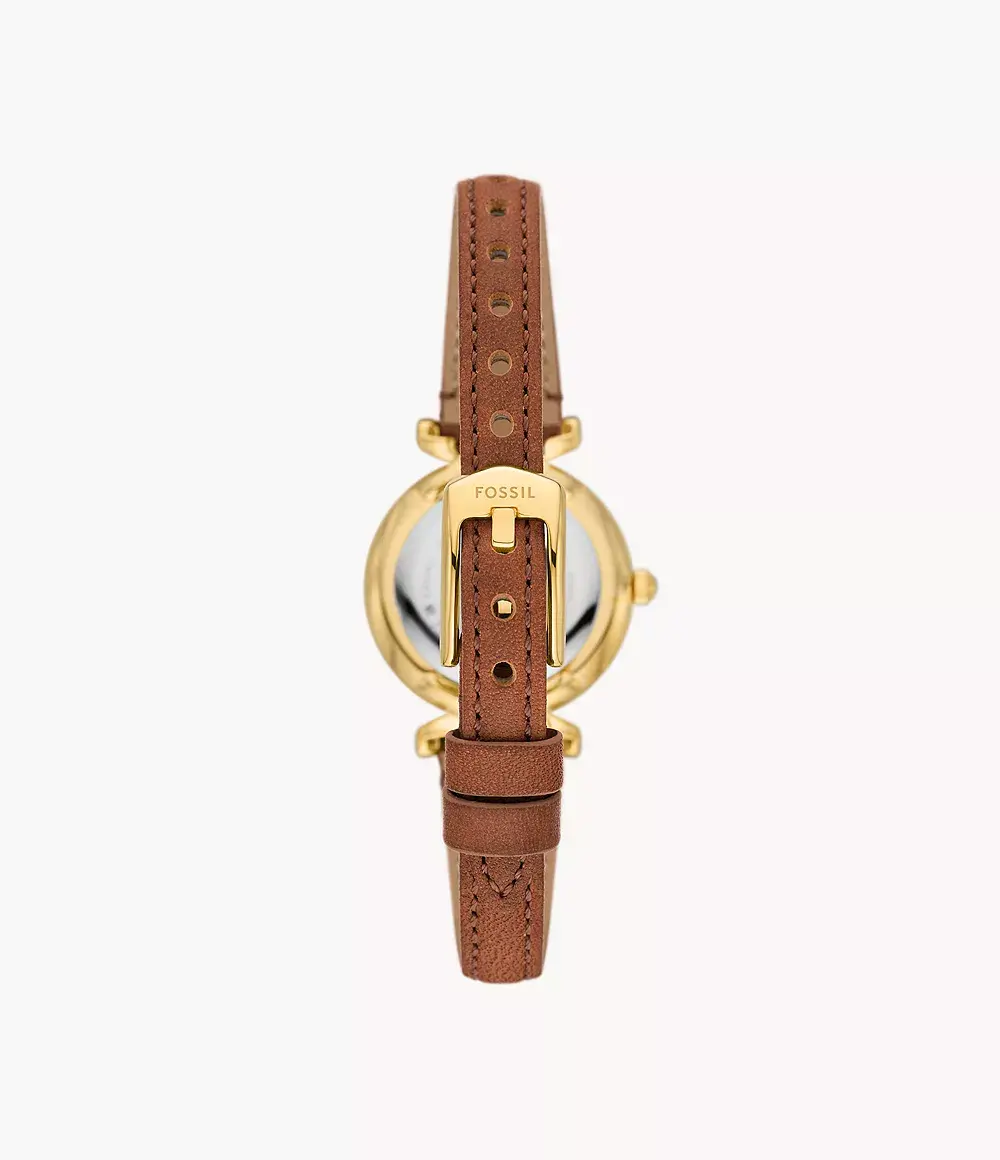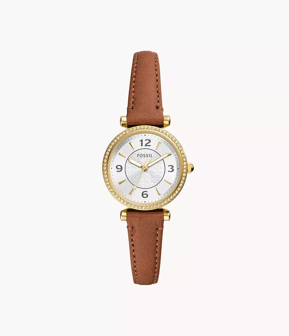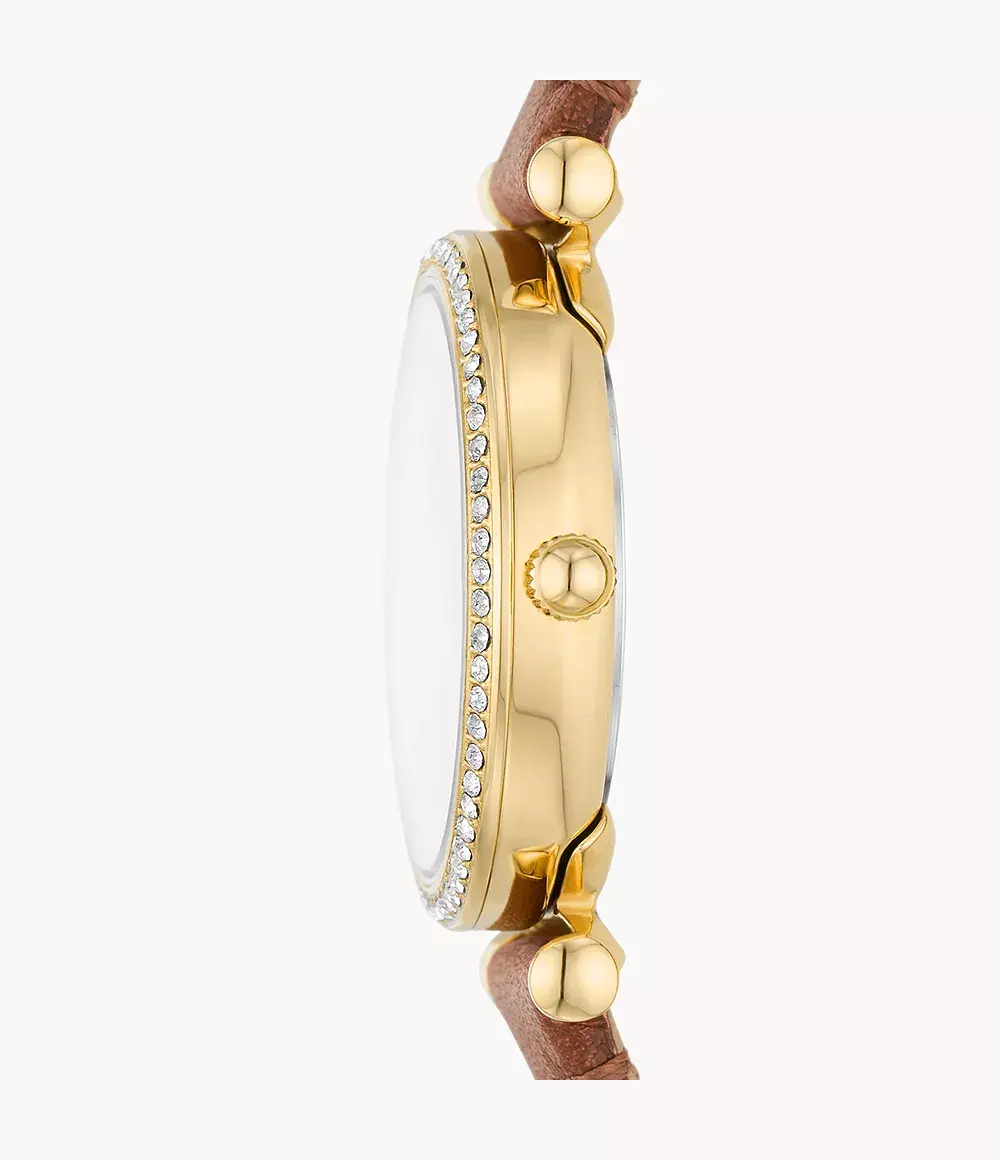 Женские кварцевые аналоговые наручные часы. Коллекция Carlie. Центральные часовая, минутная и секундная стрелки. Серебристый циферблат с часовыми метками в виде штрихов и четырёх арабских цифр. Стрелки с люминесцентным покрытием, которое светится в темноте после непродолжительного воздействия света. Круглый стальной корпус с покрытием цвета жёлтого золота. Диаметр корпуса 28 мм. Безель украшен кристаллами. Устойчивое к мелким механическим повреждениям минеральное стекло. Рифлёная переводная головка. Коричневый кожаный ремешок с классической застёжкой buckle. Водозащищённость 50WR (мытьё рук, дождь).