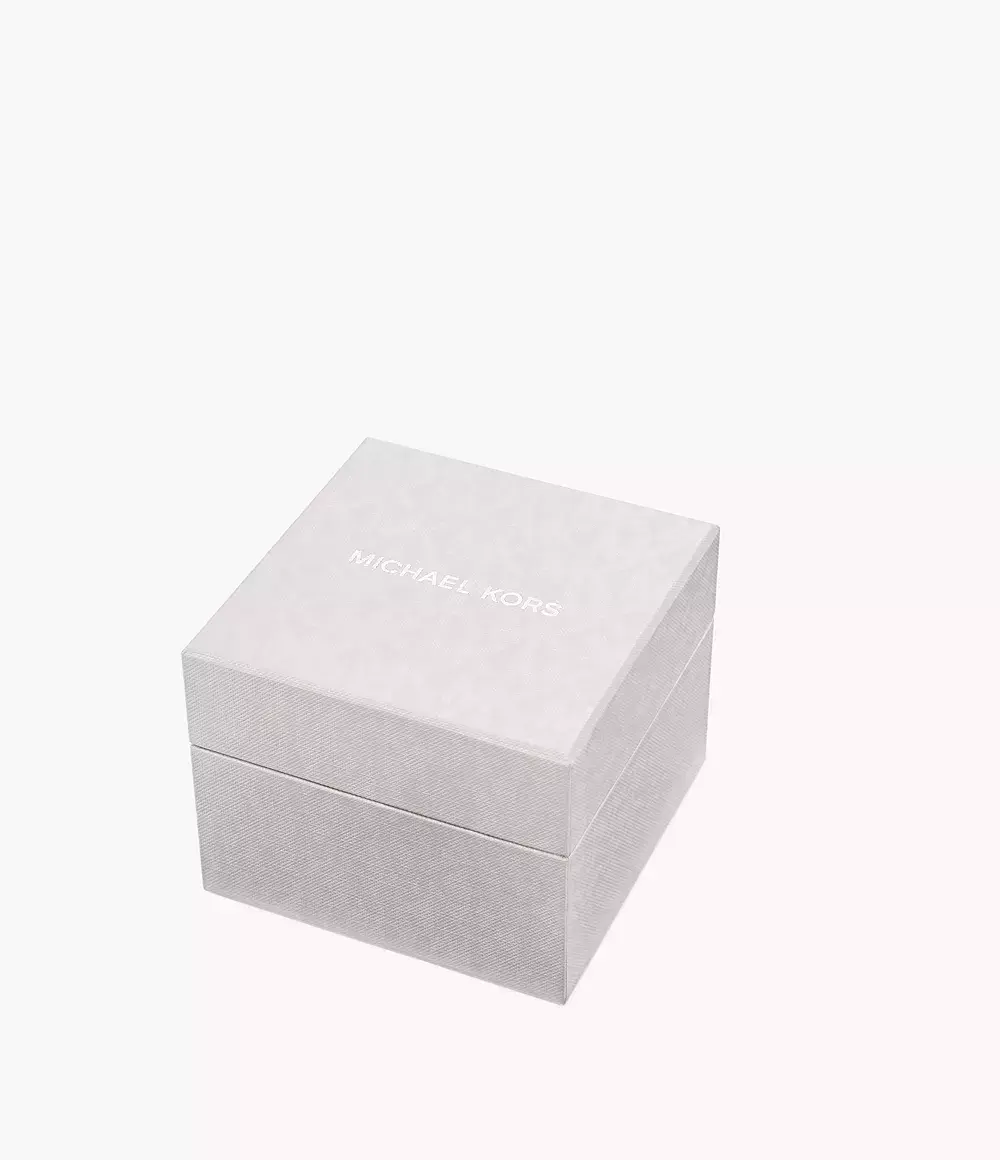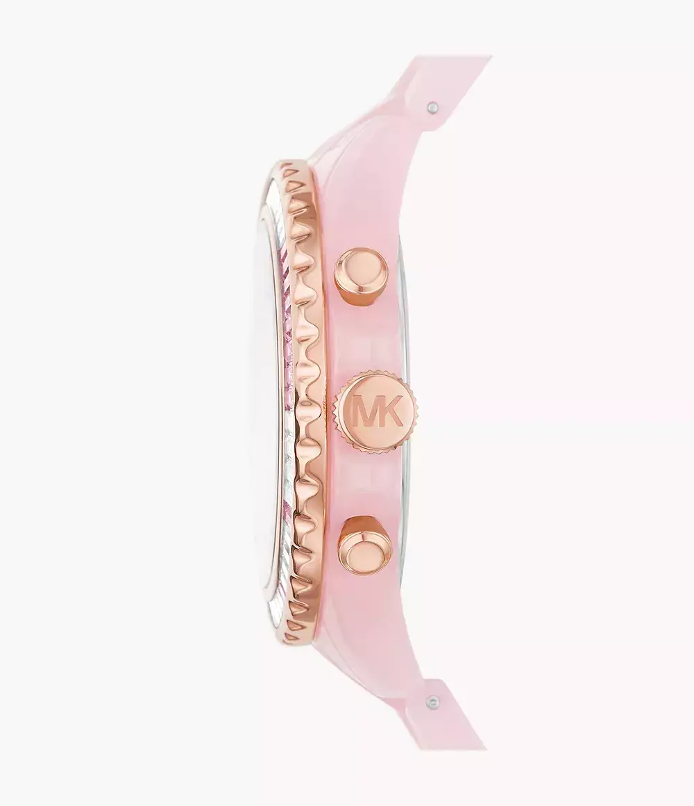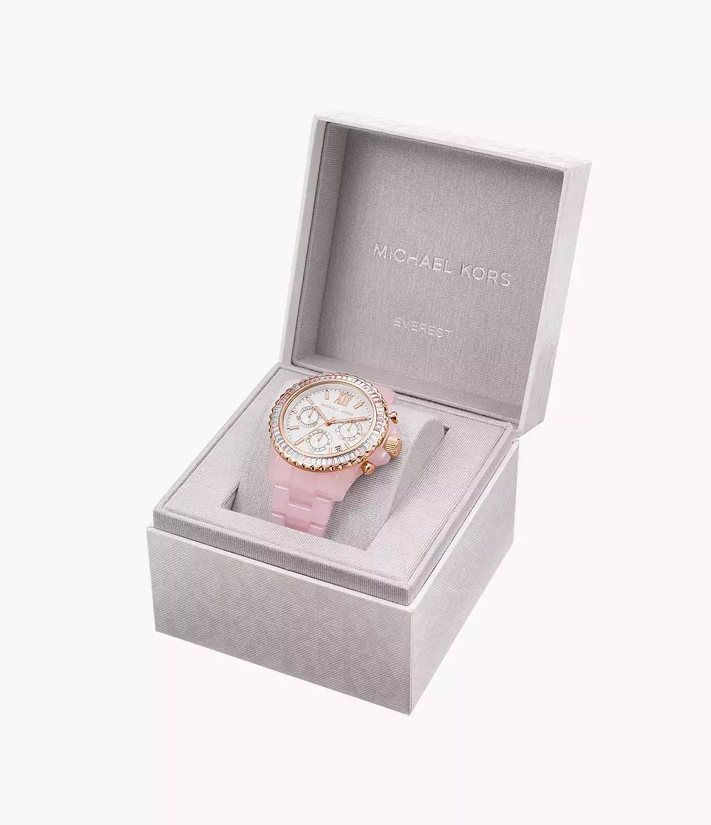 Женские кварцевые аналоговые наручные часы-хронограф с секундомером. Коллекция Everest. Центральные часовая, минутная и секундная стрелки. Стрелки и метки с люминесцентным покрытием, которое светится в темноте после непродолжительной зарядки на свету. Белый циферблат с часовыми метками в виде штрихов и римской цифры 12. Дополнительно на малом циферблате отображается текущее время в 24-х часовом формате. Окошко даты в позиции между 4 и 5 часами. Круглый стальной корпус в пластиковом «чехле» розового цвета. Диаметр корпуса 42 мм, толщина 12 мм. Корпус украшен розовыми и прозрачными кристаллами. Устойчивое к мелким механическим повреждениям минеральное стекло. Рифлёная переводная головка с защитой. Стальная задняя крышка с выгравированной подписью M Kors. Розовый пластиковый ремешок с раскладывающейся застежкой. Ширина ремешка 22 мм. Водозащита 100WR (плавание без погружения).