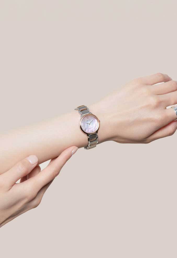 Женские кварцевые часы из серии Regular. Круглый стальной корпус с частичным покрытием цвета золота. Сапфировое стекло. Розовый перламутровый циферблат. Водозащита 50 м. Стальной браслет с частичным покрытием цвета золота. Раскладывающийся замок.